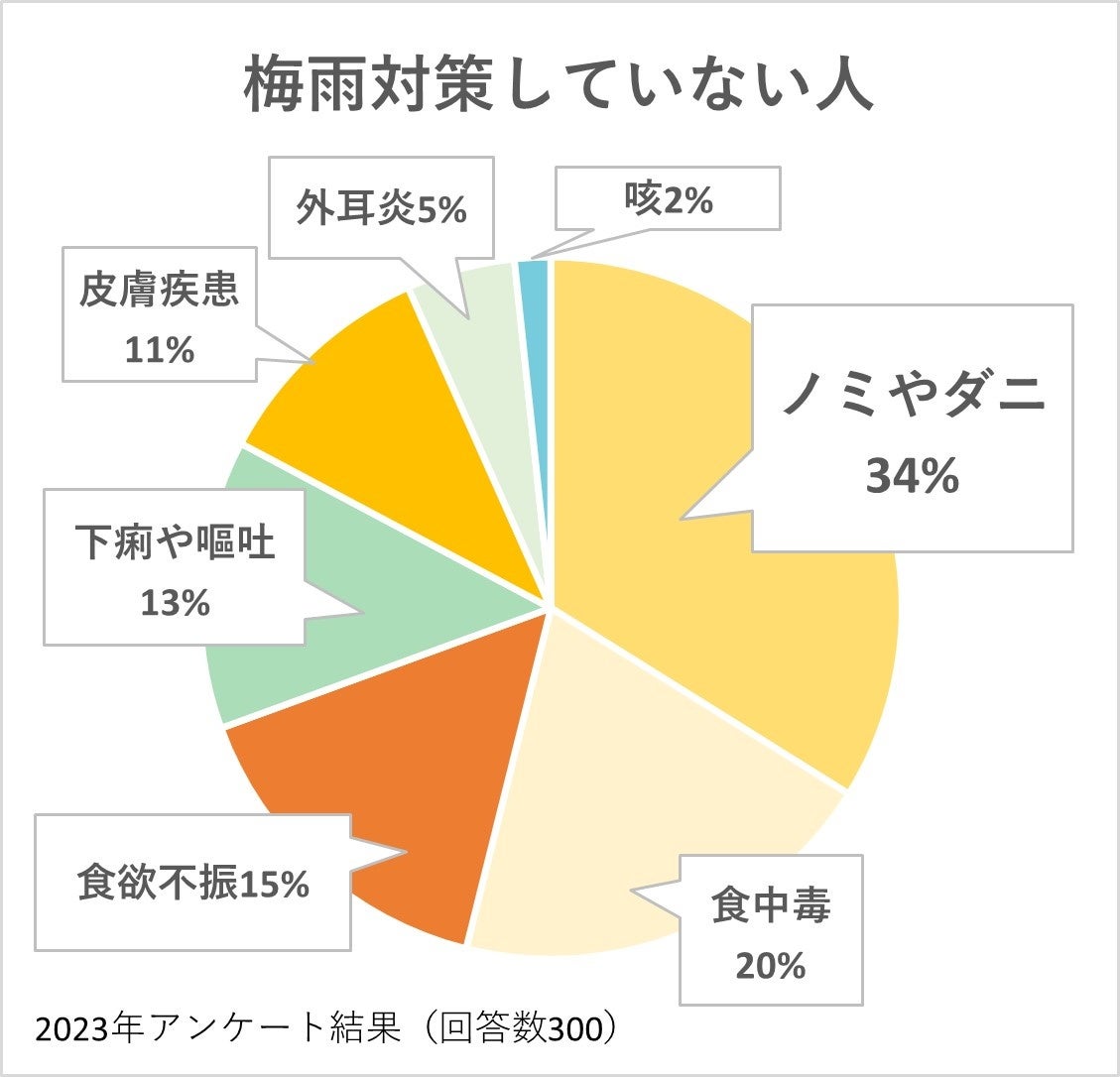 「梅雨対策をしていない」と答えた人のうち「ノミやダニ」を選んだのは最多の34%、次いで「食中毒」が20%、「食欲不振」が15%でした。