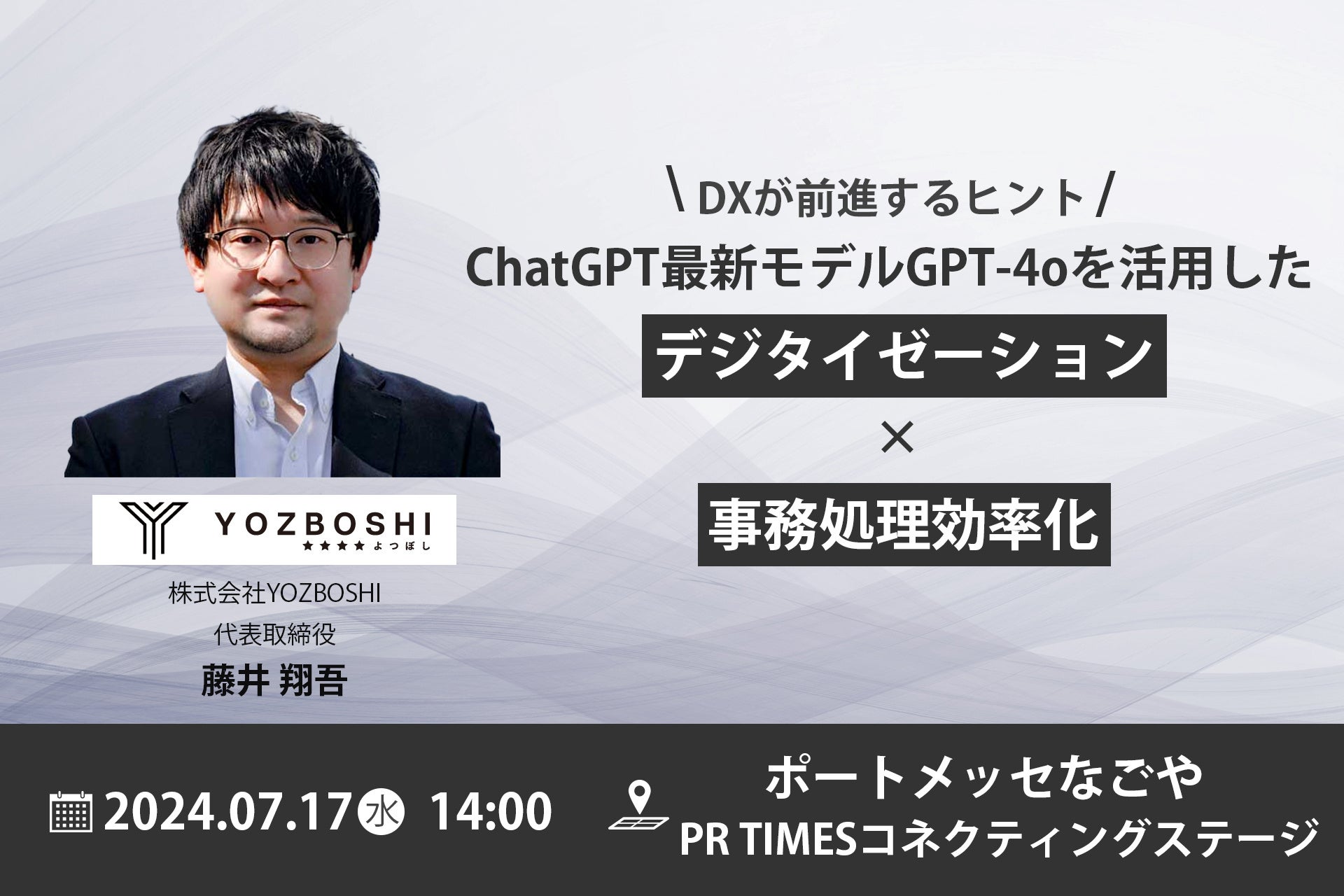 株式会社YOZBOSHI(東京都練馬区、代表:藤井 翔吾)は、2024年7月17日(水)にJapan IT Week【名古屋】にて開催される「PR TIMESコネクティングステージ」へ登壇いたします。当社代表取締役の藤井が、DX推進する上での次なる考慮ポイントとともに、ChatGPT(GPT-4o)を活用した事務作業効率化について紹介いたします。