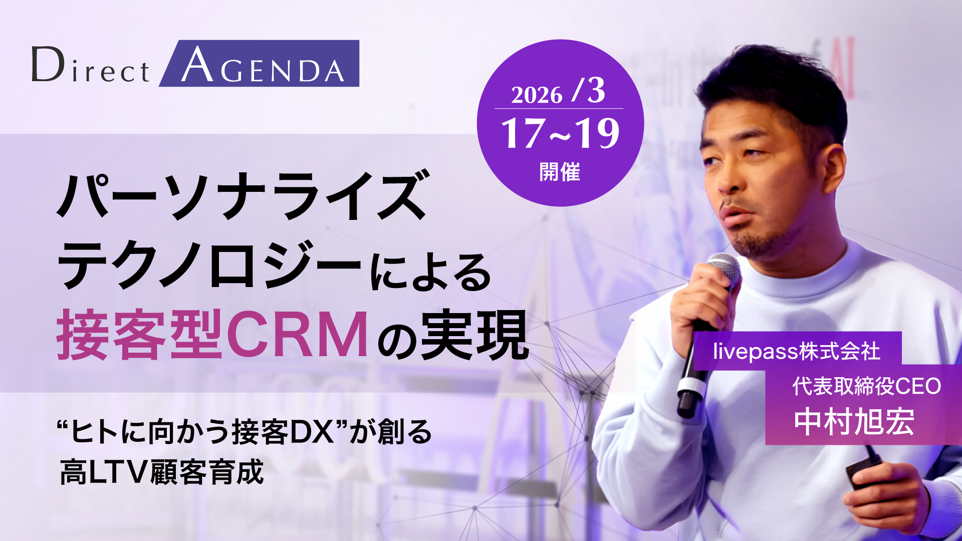 livepass株式会社(本社:東京都港区、代表取締役CEO:中村旭宏、以下livepass)は、2026年3月17日〜19日に熊本で開催されたマーケティングカンファレンス「ダイレクトアジェンダ2026」に登壇し、livepass独自のパーソナライズテクノロジーを活用した「接客型CRM」の実現と、「接客型CRMの高LTV顧客育成における有効性」について、具体的な成果を交えて紹介しました。