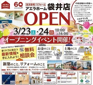 今回のオープンを記念して、「アエラホーム袋井店」では、2024年3月23日(土)、24日(日)に、2つのイベント「なんでも無料相談会」、「人気のキッチンカーがやってくる」を実施いたします。「なんでも無料相談会」では、お金のこと、土地のこと、新築のこと、リフォームのことなど、家づくりに役立つ最新情報についてご相談いただけます。また、「人気のキッチンカーがやってくる」では、地元で人気のキッチンカーが出店し、おいしいパンやスイーツをご来場者全員にプレゼントいたします。