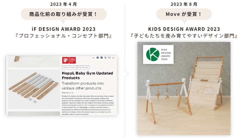 商品化までの道のりが高く評価されたことで2023年4月、「iF DESIGN AWARD 2023 プロフェショナル・コンセプト部門」を受賞し、また引き続き同年8月、完成した商品Moveは「子どもたちを生み育てやすいデザイン部門」で「KIDS DESIGN AWARD 2023」を受賞しました。
