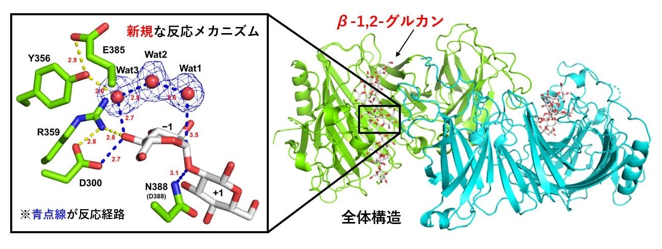 次に、β-1,2-グルカン加水分解メカニズムを立体構造に基づいて説明するため、OpgDのD388N変異体を用いて、OpgDのミカエリス複合体構造(*9)を決定しました。このOpgDのミカエリス複合体構造の観察により、反応メカニズムに関する仮説を立てることができました。この仮説をより信頼性の高いものにするために変異酵素解析などをおこない、図2に示すような反応メカニズムが提唱されました。サブサイト(*10)−1と+1の間に位置する触媒残基D388が、基質グリコシド結合の酸素にプロトンを供与することで、この結合の分解を促します。また、もう一つの触媒残基D300が、2つの水分子(Wat2、Wat3)と1つの基質のヒドロキシ基(OH基)を介して、求核水(Wat1)を活性化します。推定された反応機構は、このように他のGHファミリーでは例を見ないほどに長いプロトン移動経路をもっていました。