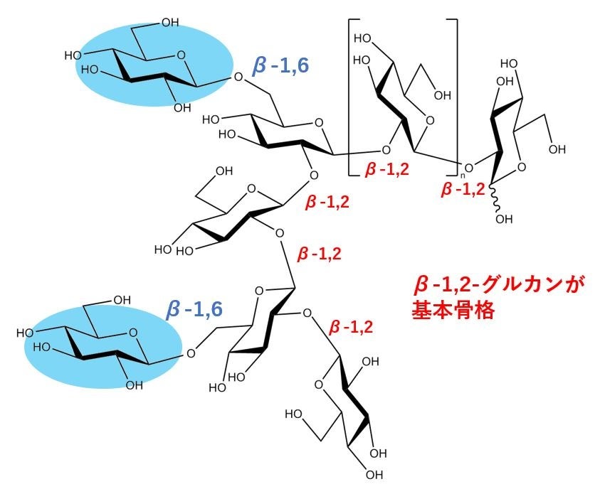 グルコースがβ-1,2-結合というめずらしい様式で結合した多糖。環状構造をもつβ-1,2-グルカンは、疎水性の化合物と複合体を形成することで、水に溶けやすくさせる性質などをもつことから、薬学や食品科学分野への応用が期待されるが、機能性に関する研究はまだ十分に進んでいない。