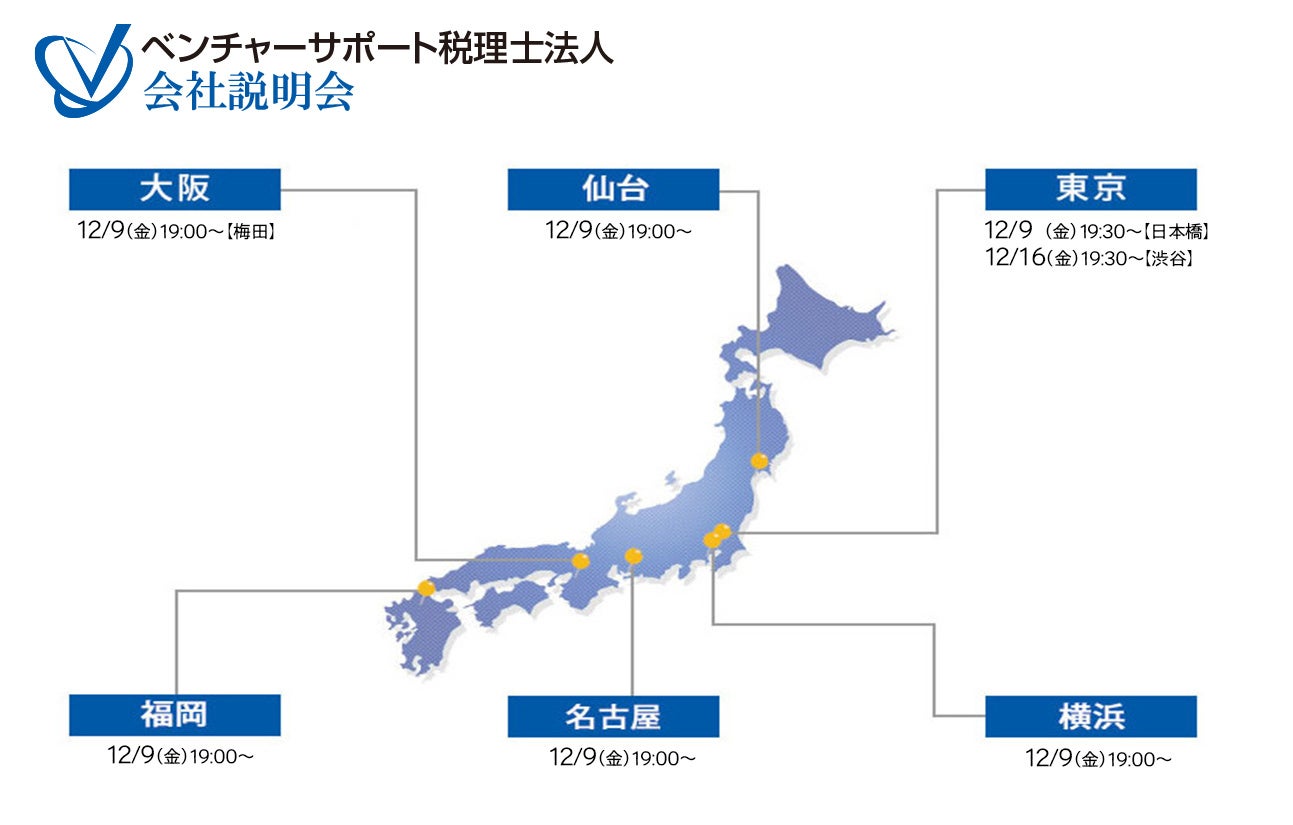 ベンチャーサポート税理士法人(本社:東京都渋谷区 代表税理士:中村真一郎)は、12月、全国7か所にて就職希望者向け会社説明会を開催いたします。
