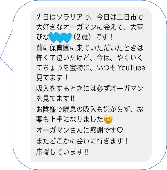 保育園訪問の目標件数は50件を目標にしていましたが、オーガマンが訪園し、歓喜する子どもたちの様子を見た保育園の先生方からの口コミで希望が殺到し、結果的には目標を大きく上回る84園を訪問することができました。