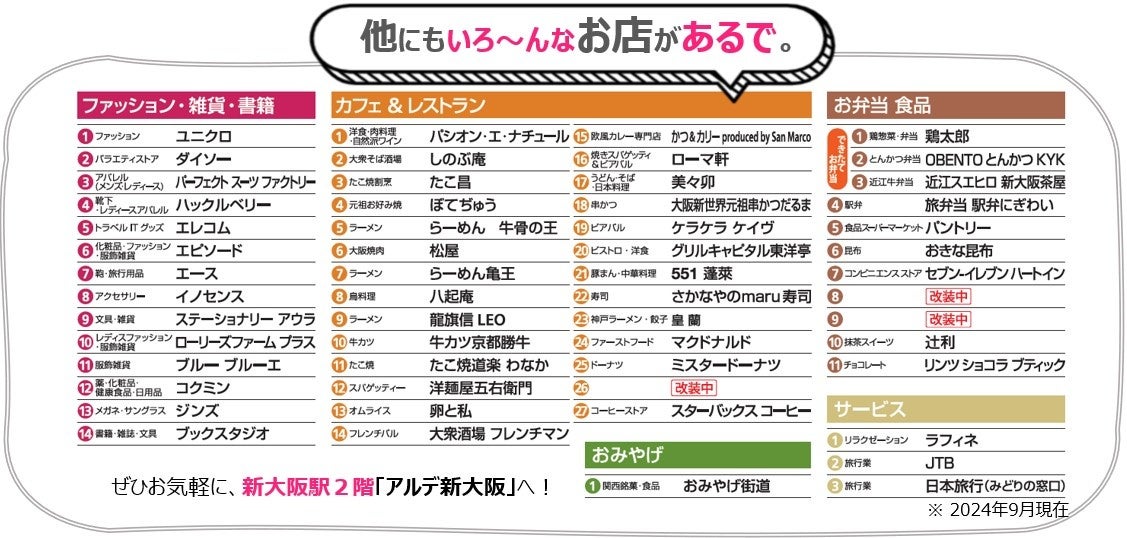 「アルデ新大阪」(運営会社:新大阪ステーションストア)は、大阪・関西の玄関口である新大阪駅の2階(改札外)にあるショッピングセンター。関西の食文化にこだわりながら、出先で便利なお店を揃えております!