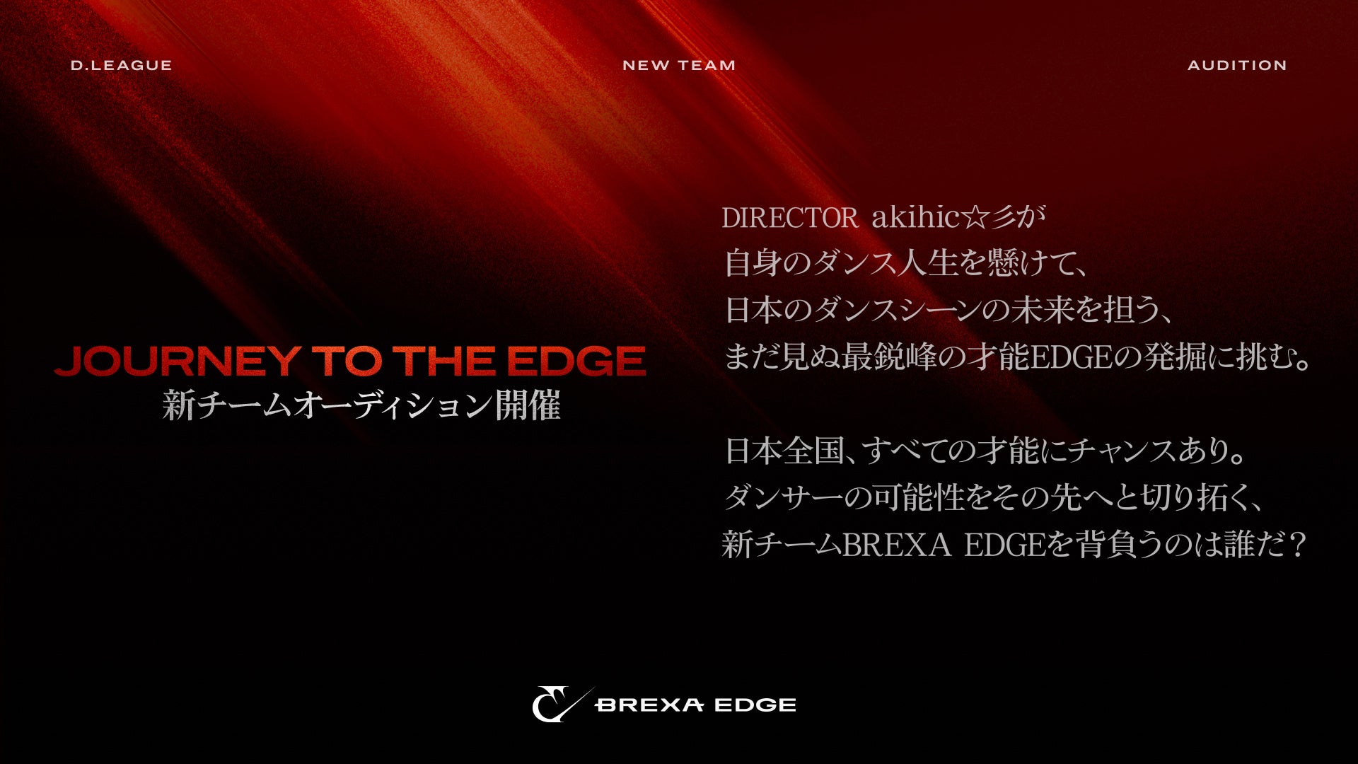 新チーム発足にあたり、BREXA EDGEは、 ダンサーとしてプロスポーツ選手を志す方向けにキャリア形成の機会を提供するため、日本全国から最鋭峰の才能を発掘する公開オーディションプロジェクト「JOURNEY TO THE EDGE」を始動します。本プロジェクトの全貌や、今後発表される募集要項、選考の舞台裏については、本日開設する公式SNSにて順次情報の発信を行う予定です。