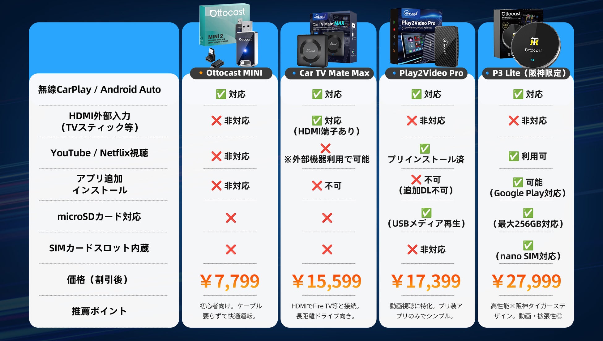 OTTOCASTの人気車載ガジェット4製品は、それぞれに異なる魅力と用途があります。