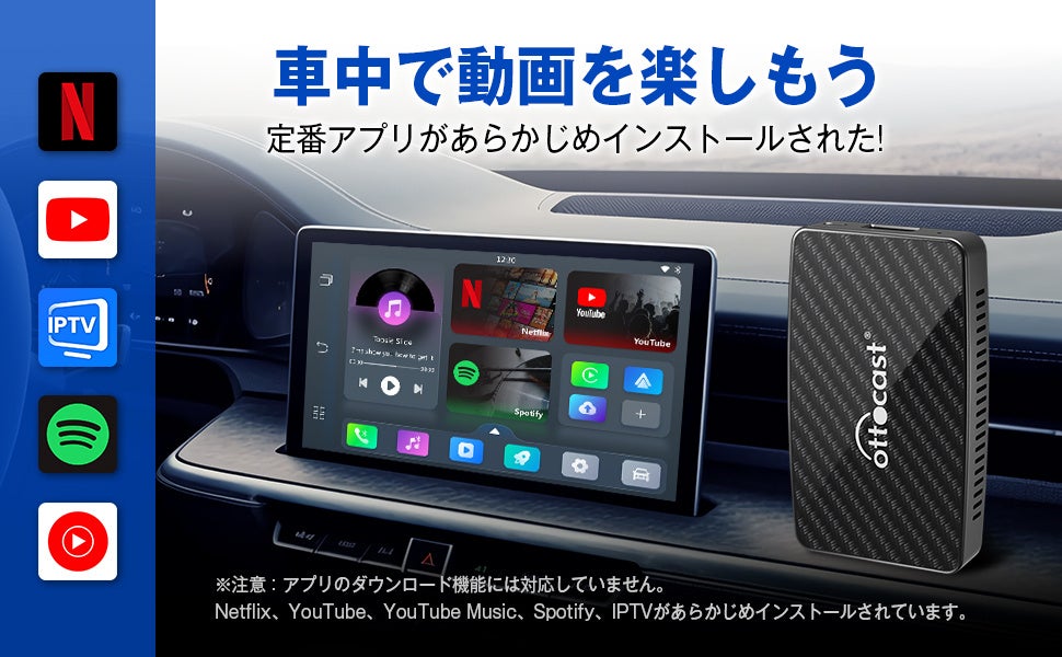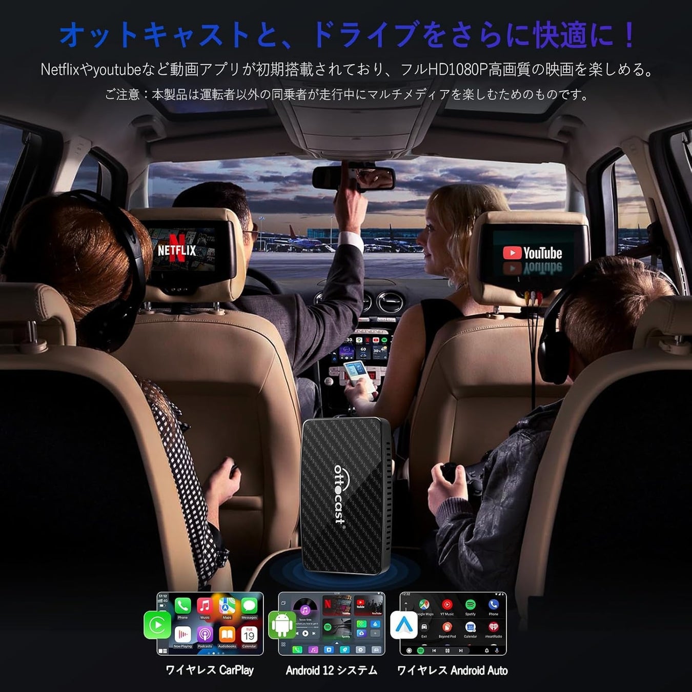 Ottocast Play2Video Proは、ワイヤレスCarPlay/Android Autoに対応しつつ、Android 12システムを搭載した高性能モデルです。YouTube、Netflix、Spotifyなどの人気アプリがプリインストールされており、車内で直接動画や音楽を楽しむことができます。
