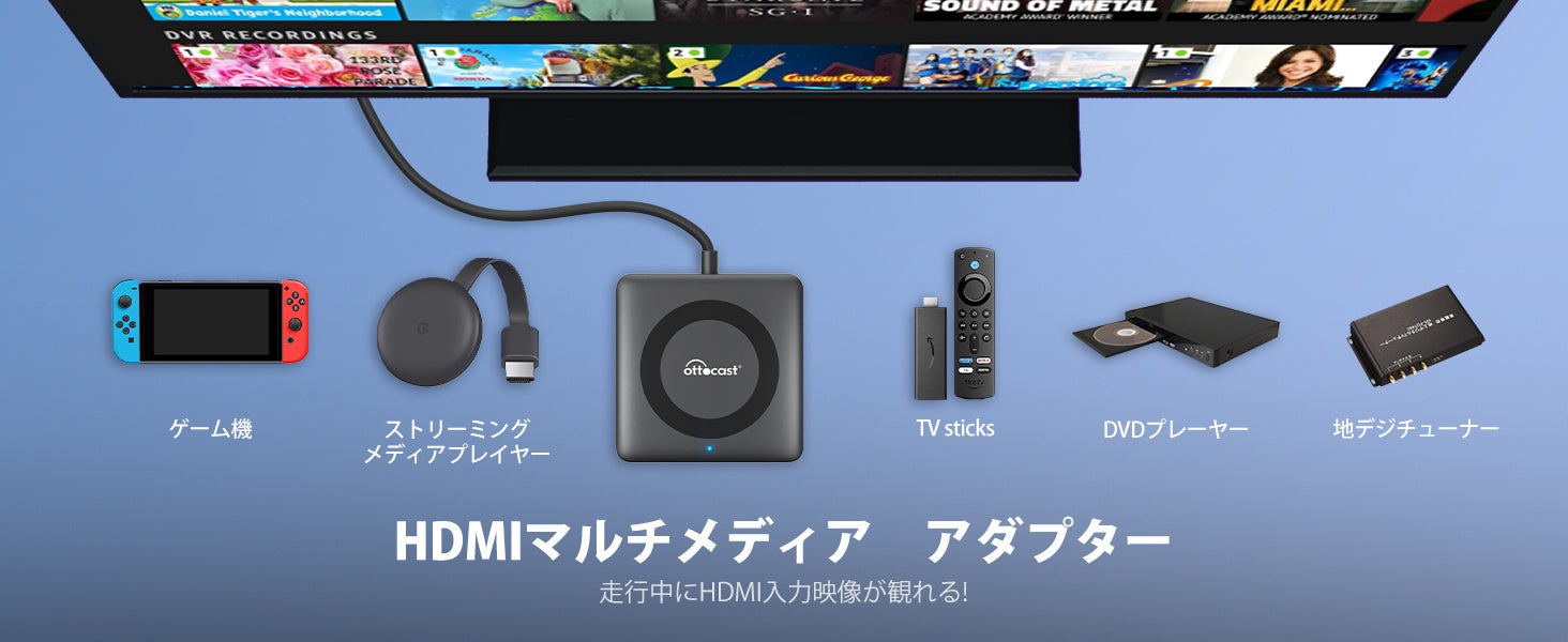 すべての有線CarPlay/Android Autoをワイヤレス化できる高性能アダプター。さらにHDMI入力端子を搭載し、Fire TV Stick・DVDプレイヤー・地デジチューナーなどさまざまな機器と連携可能。