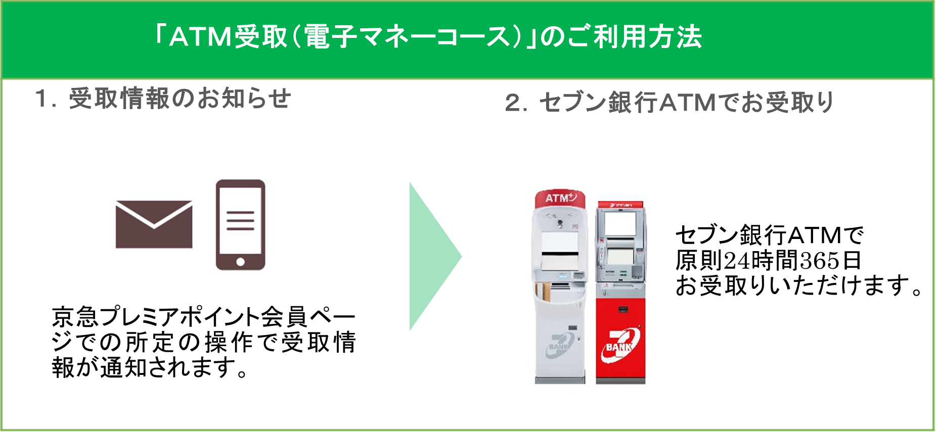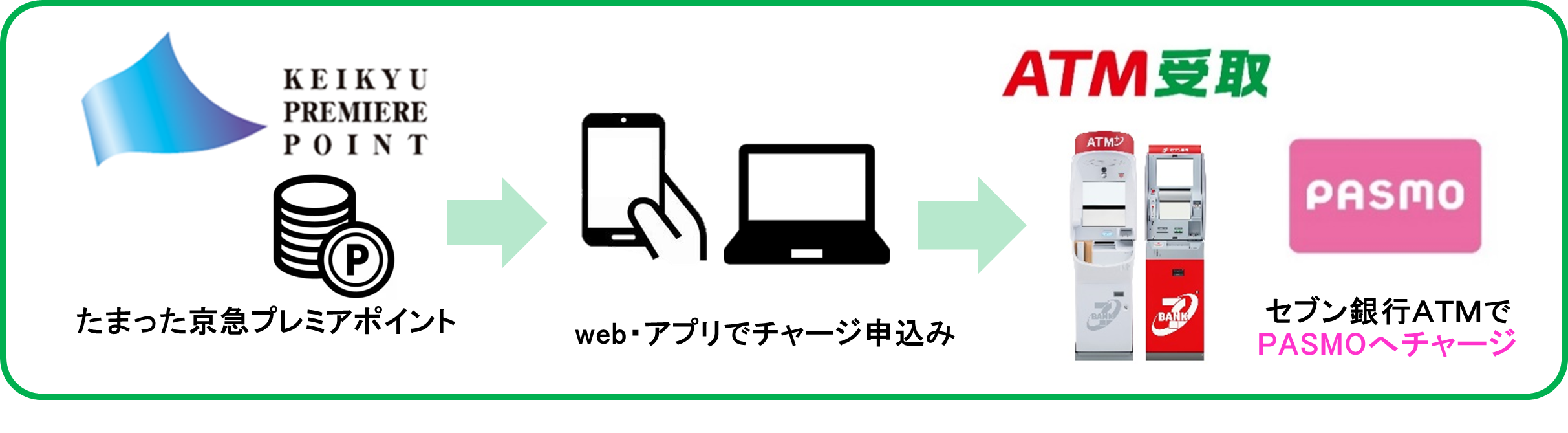 本合意により、セブン・ペイメントサービスが提供する「ATM受取(電子マネーコース)」を通じて、たまった「京急プレミアポイント」を1ポイント=1円分としてセブン銀行ATMで原則24時間365日、PASMOへチャージすることができるようになり、よりお得で便利にご利用いただけます。