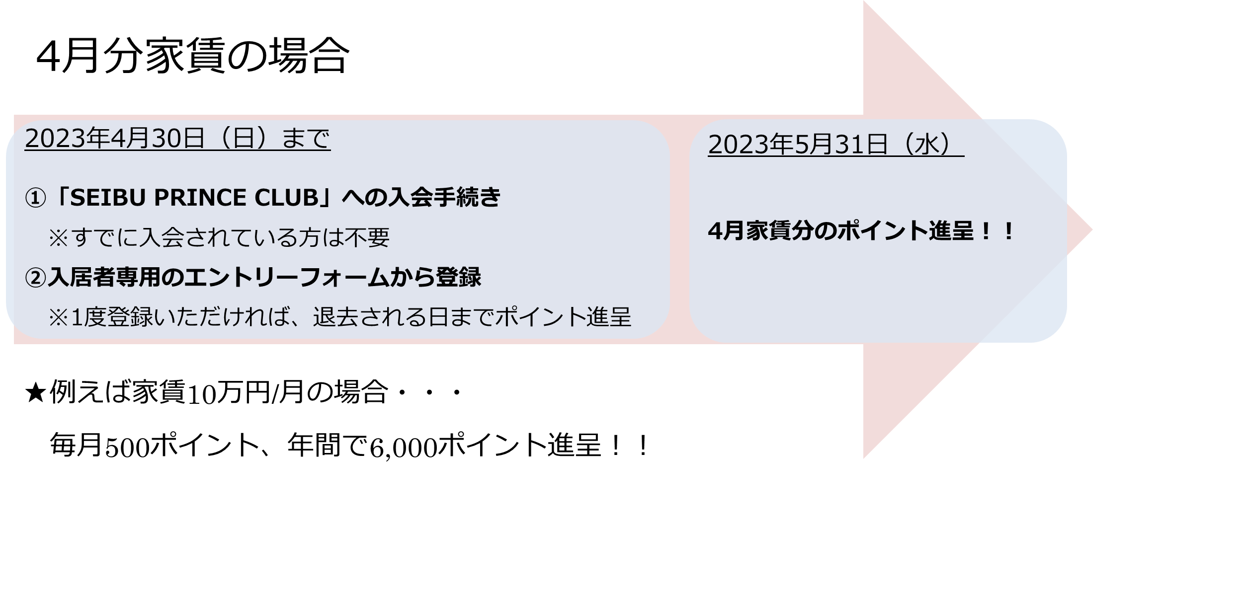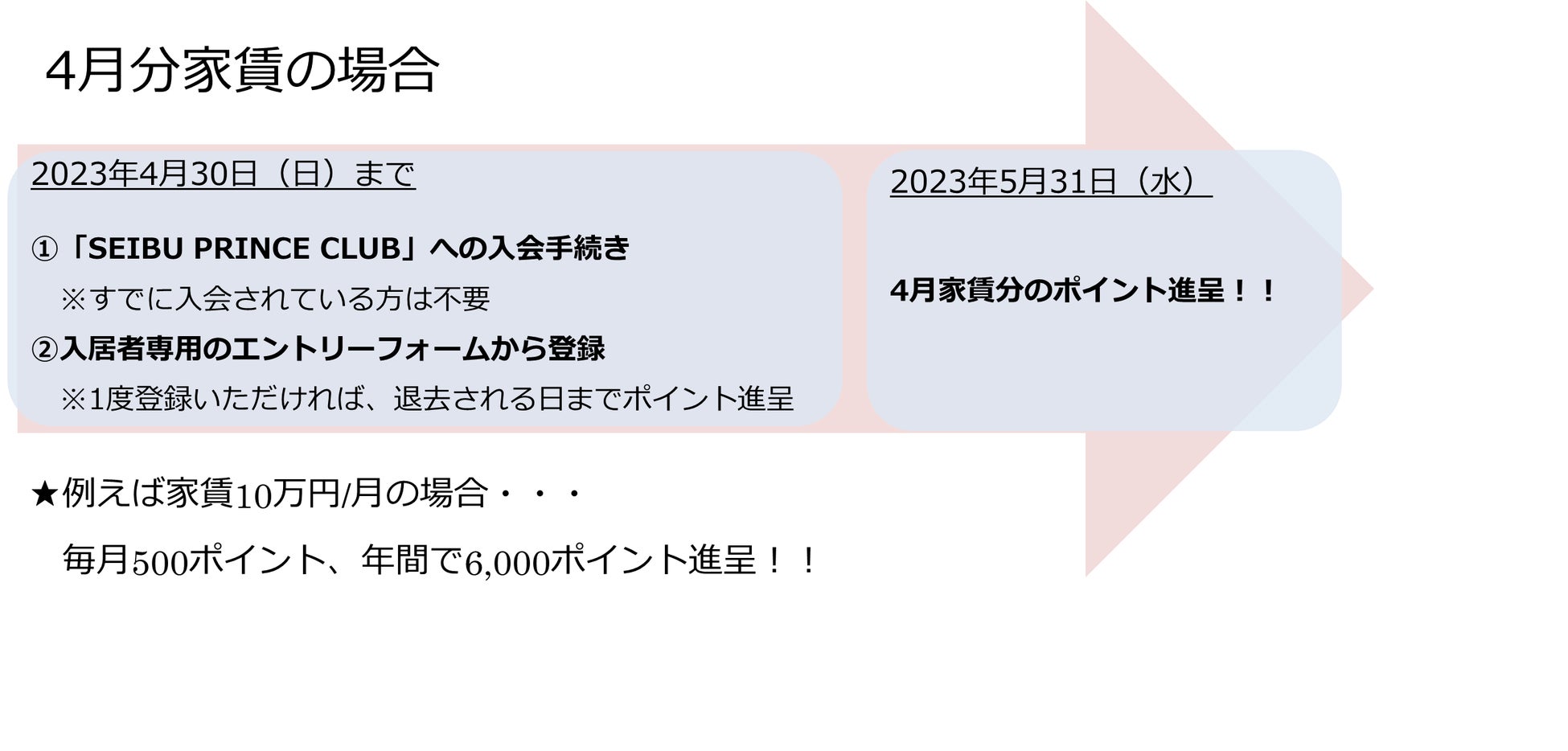 「emilive」シリーズの個人契約者のうち本サービスへの申し込みを行い、登録完了した方に対して、家賃支払額の0.5%(1ポイント未満は切り捨て)相当の SEIBU Smile POINTを進呈します。