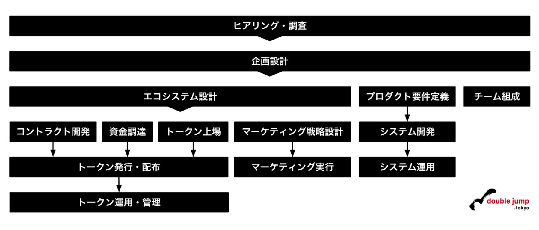 double jump.tokyo社の持つweb3領域の豊富な企画・開発実績と、BOBG社のトークン発行・運用の実績を掛け合わせることで、トークン発行における複雑な論点を解決し、トークン発行の企画から発行後の運用まで包括的にサポートします。