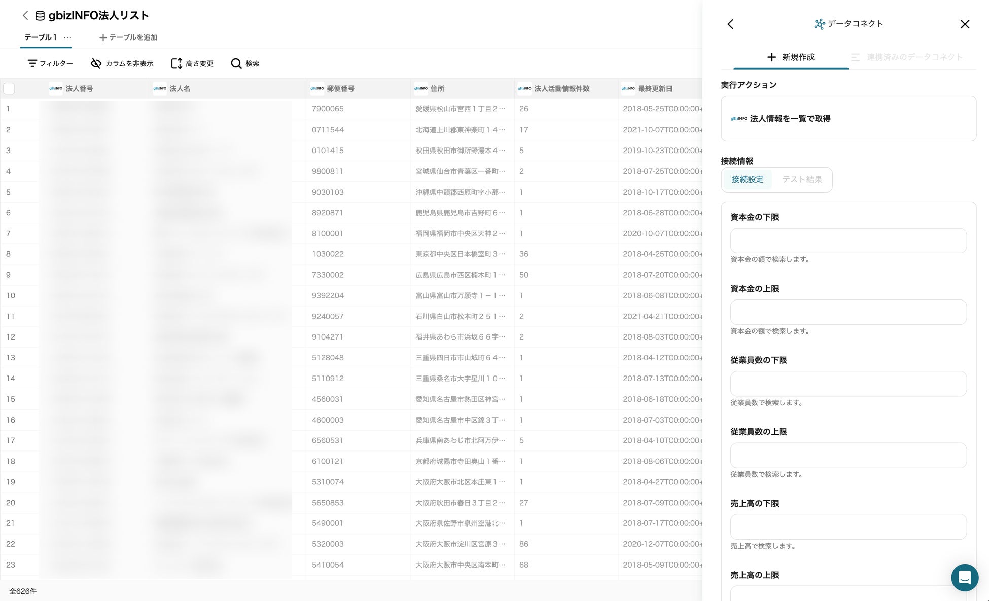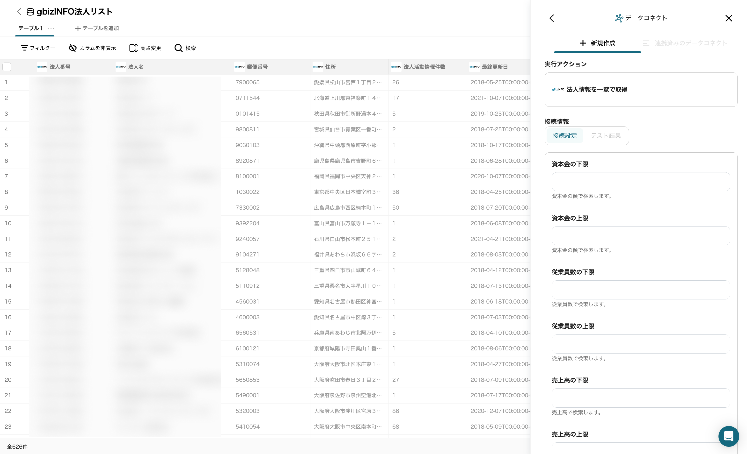 今回Yoomと連携したことで、法人情報の検索、Yoom内のデータベースや自社のデータベース上でのリスト作成などを自動で行うことができます。Yoom内のデータベースを利用している場合、データコネクト機能を活用することで、「売上額」「従業員数」「資本金」など、特定の条件に合った法人をピックアップし、リスト作成することも可能です。