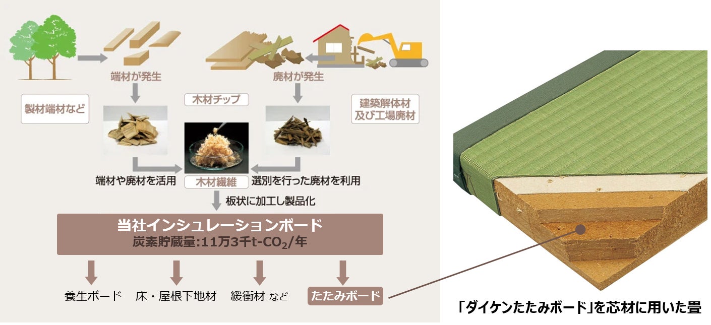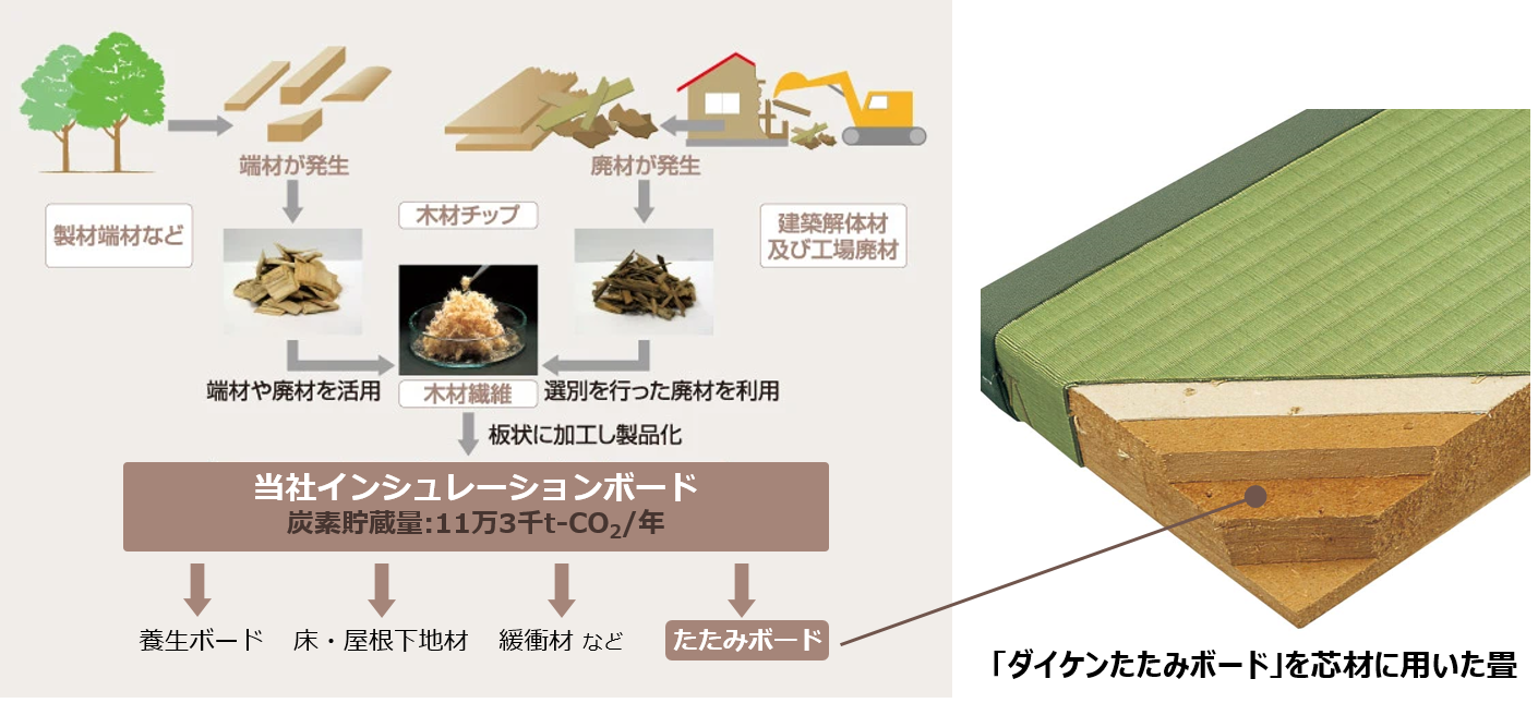 「ダイケンたたみボード」とは、建築廃材や製材端材を原材料とする木質繊維板「インシュレーションボード」の用途の一つとして、畳床向けに当社が1973年より製造・販売するものです。炭素貯蔵機能を有する木材を無駄なく有効活用したサステナブルな素材として、CO2の排出抑制に貢献しているほか、現在、国内で流通している畳床の約7割のシェアを誇るなど、環境に配慮しながらも、伝統ある日本の畳文化の継承を陰ながら支えているロングセラー製品です。