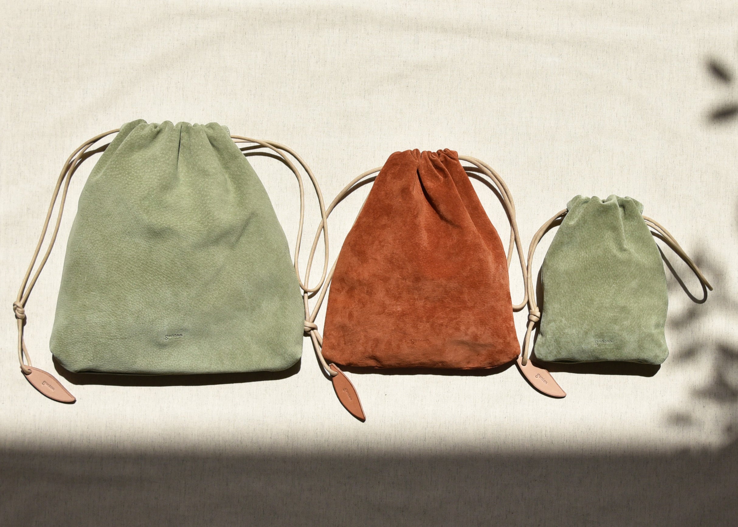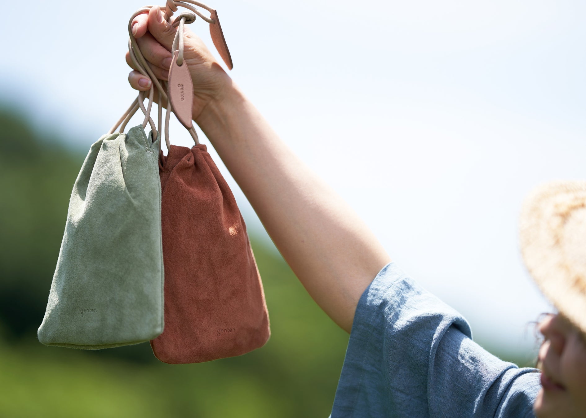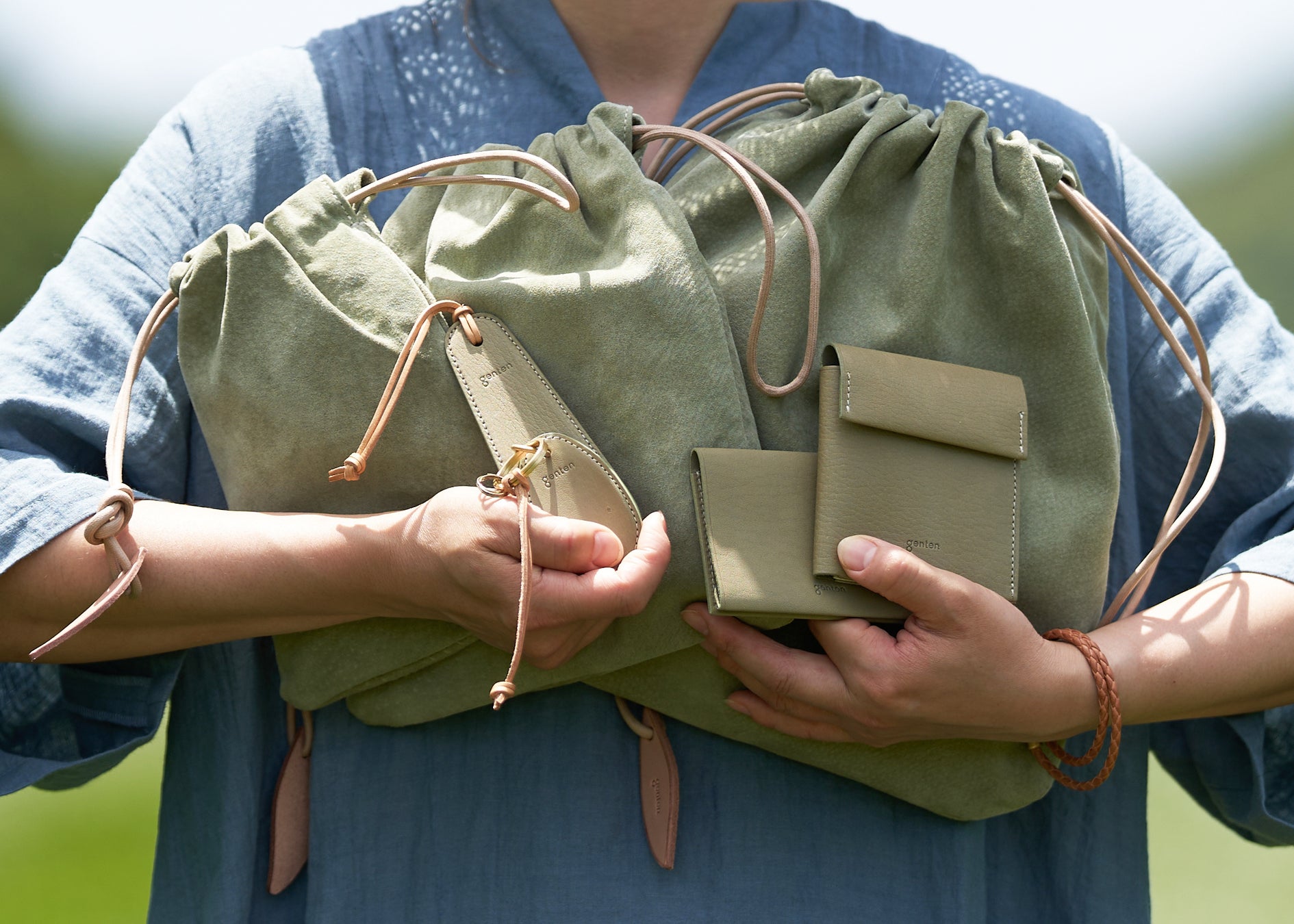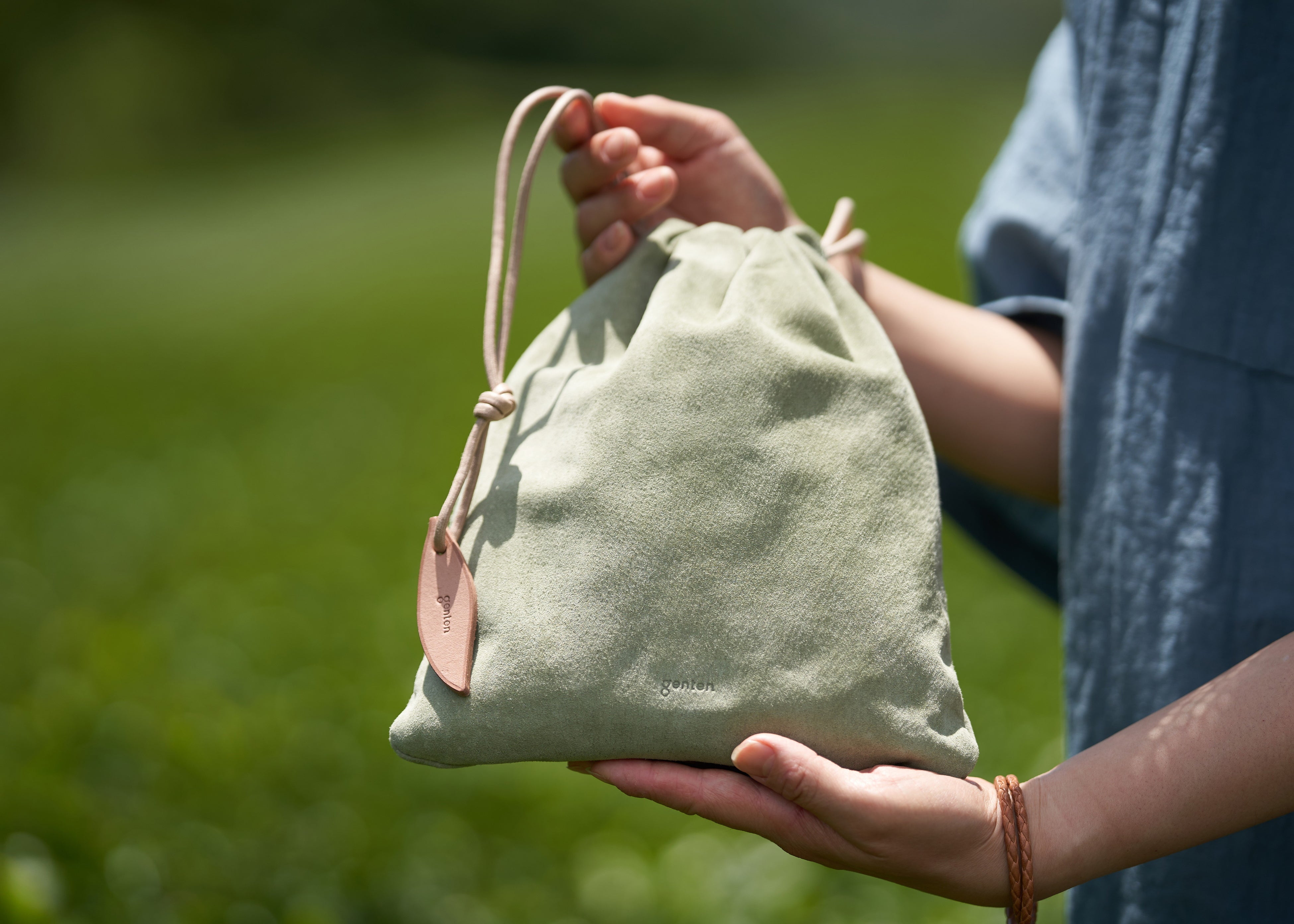 シンプルで使い勝手の良い巾着もでき上がりました。素材は、国産の上質なピッグスエードを茶殻染色剤で鞣したもの。サイズは3つあり、小・中は、細かな持ち物の整理に役立つ大きさです。