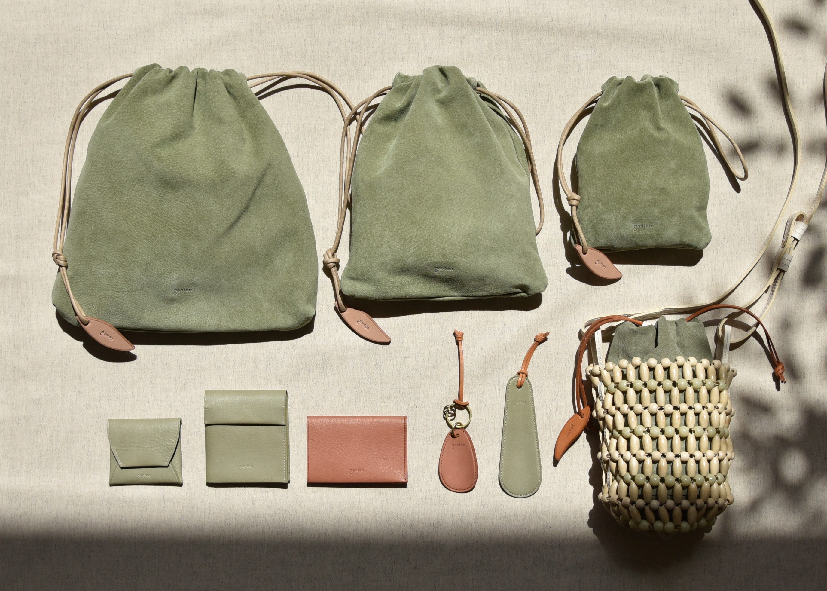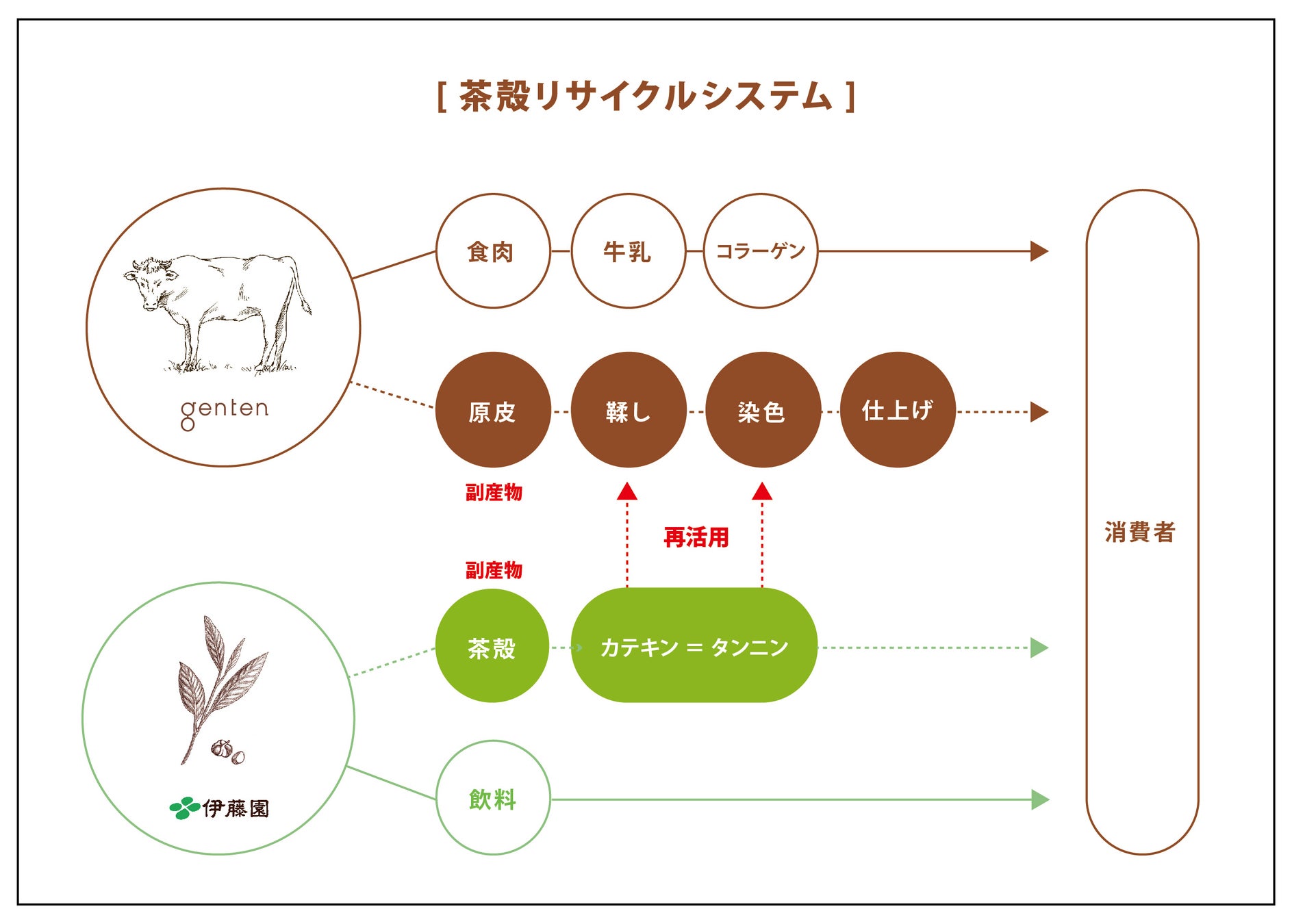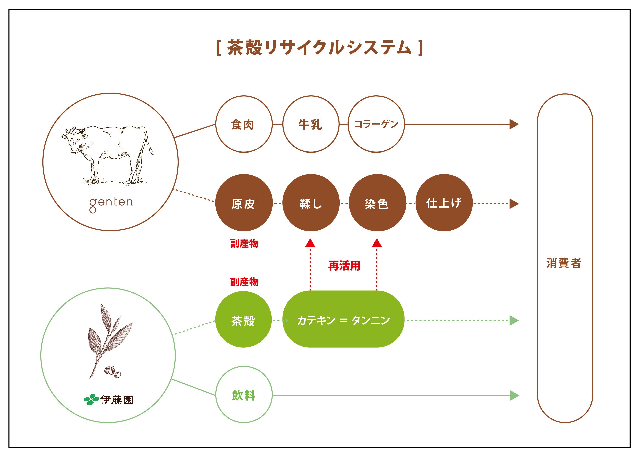 gentenとのコラボから生まれたのは、茶殻染色剤で鞣した革。畜産の副産物である革とお茶飲料の副産物である茶殻。2つの副産物から生まれたエシカルな新作です。