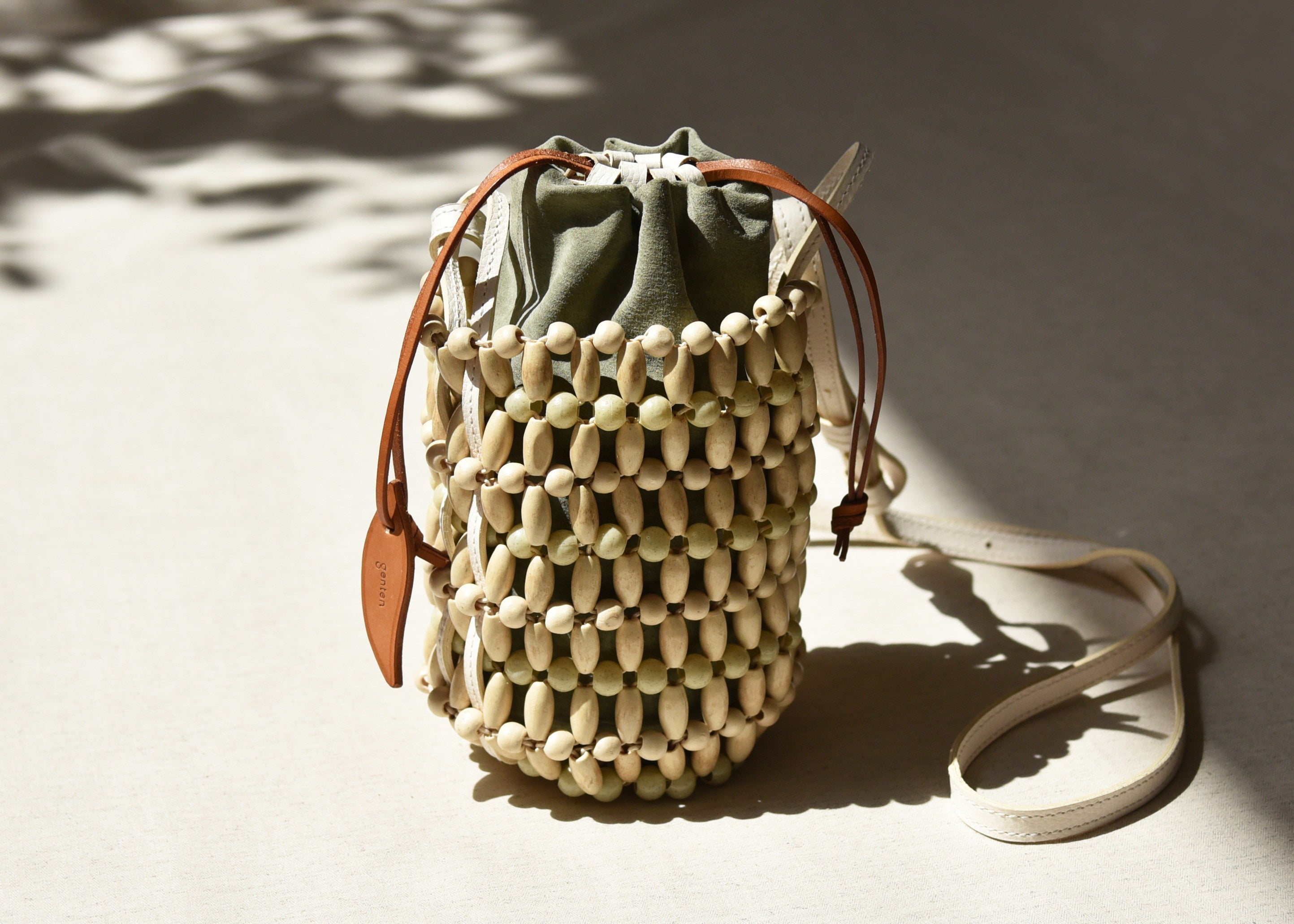 手しごとで編み立てたビーズは、淡いグリーンとベージュの2色仕立て。淡いグリーンの方は、茶殻を粉砕して樹脂に練り込ませたリサイクルビーズです。