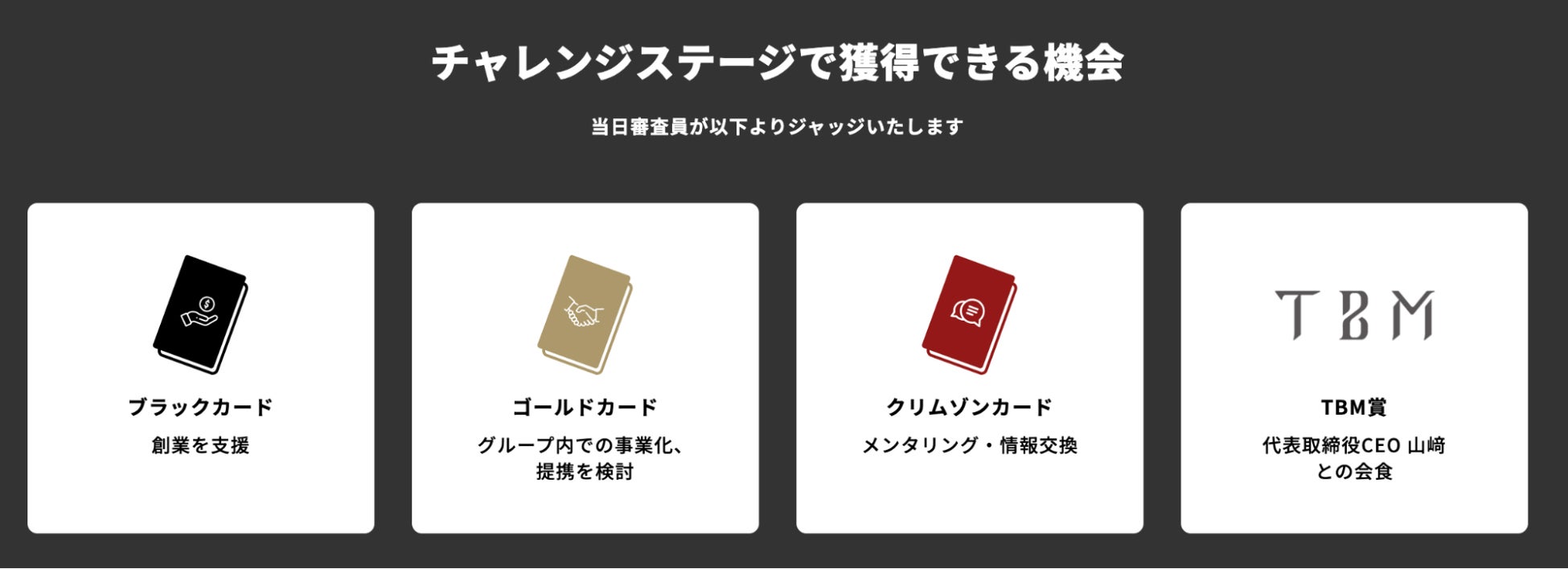 チャレンジステージでは4つの機会を獲得することができます。1.創業を支援、2.TBMグループ内での事業化、提携を検討、3.その他(メンタリング、情報交換等)。加えて、TBM賞として代表取締役CEO 山﨑氏との会食の機会が与えられます。