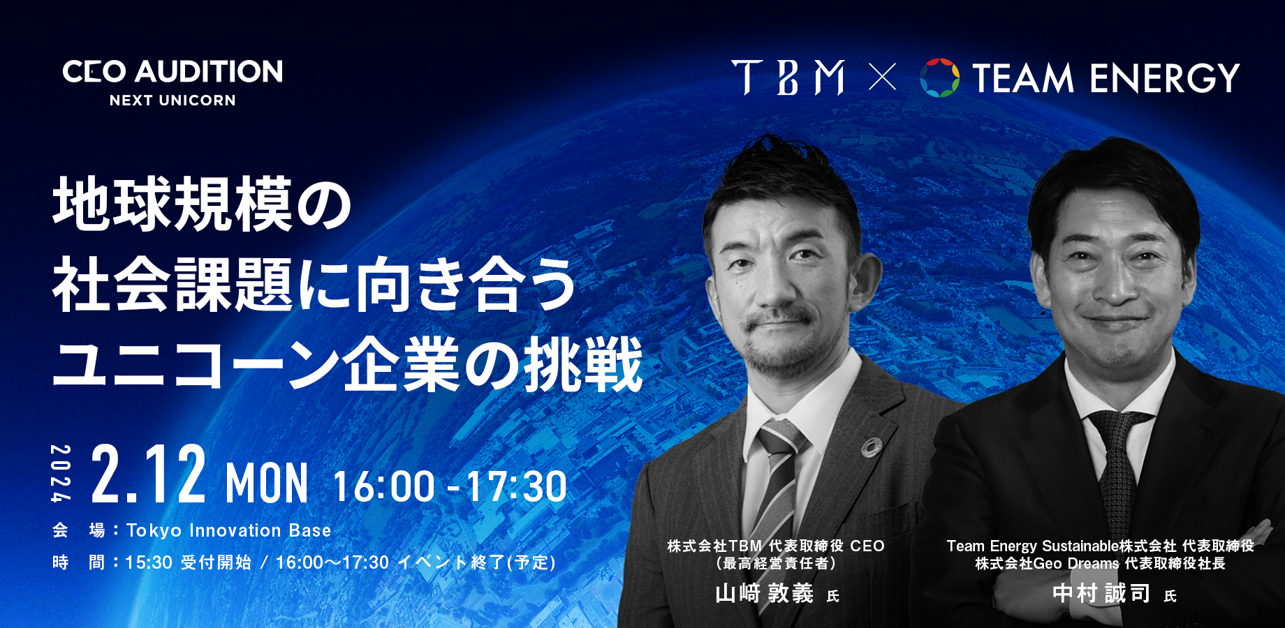 TBM 山﨑 氏 × Team Energy Sustainable 中村 氏による特別対談イベント「地球規模の社会課題に向き合うユニコーン企業の挑戦」を開催。