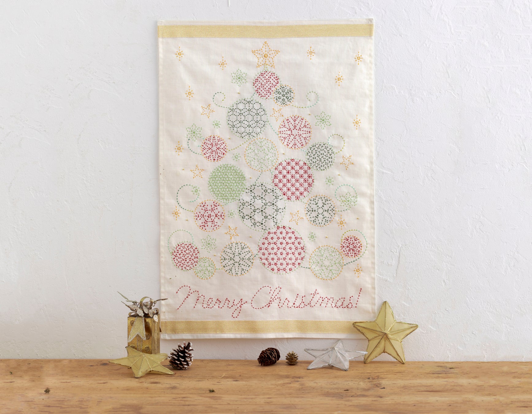 5色の糸を使い、刺し子の伝統模様で表現したグラスボールと雪の結晶模様でクリスマスツリーを仕上げます。上下にラメリボンを飾って、より華やかに。手軽な手づくりアイテムとしてもおすすめです。