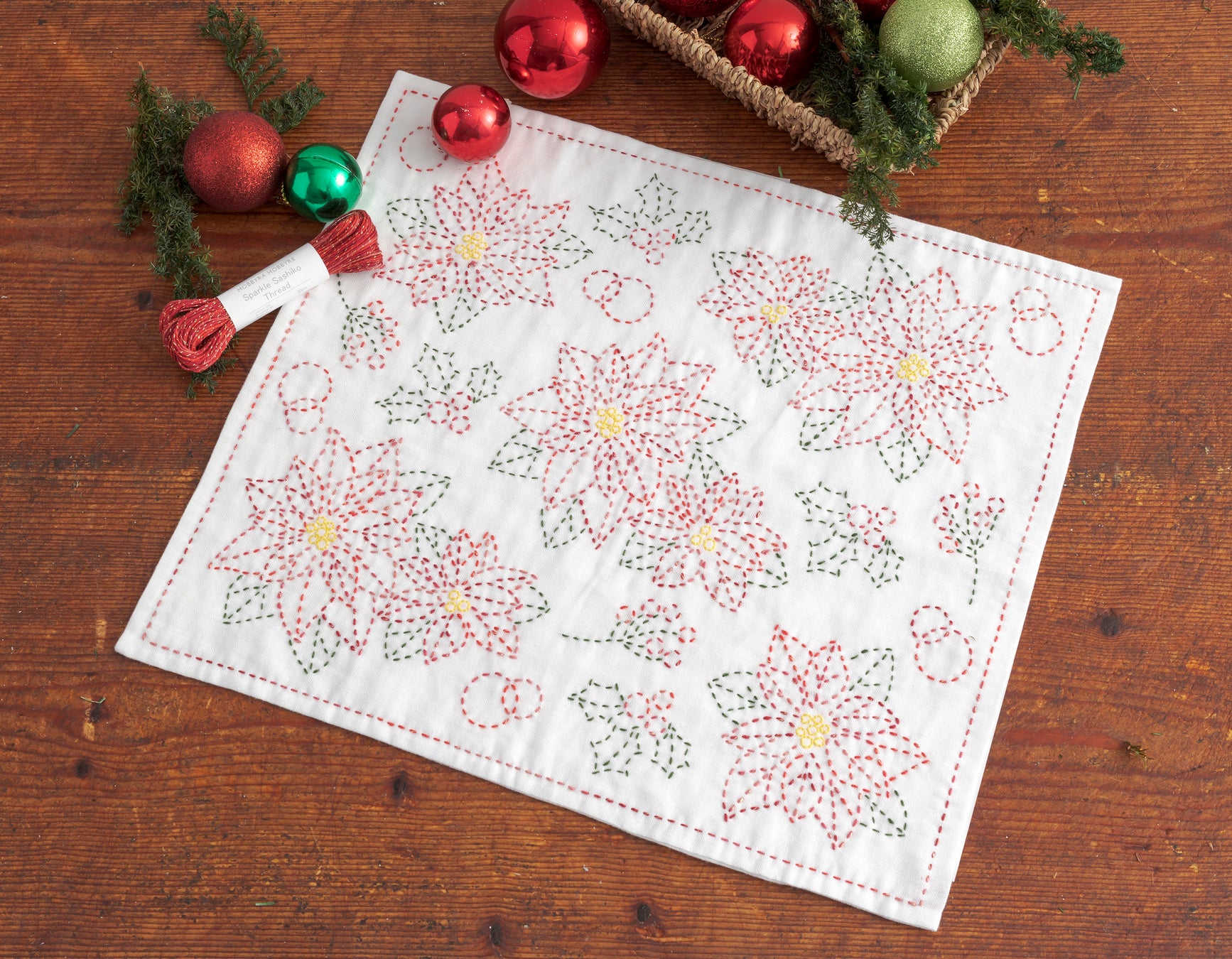 ポインセチアをメインにヒイラギやヤドリギを組み合わせたクリスマス向けデザインの刺し子ふきん。赤系刺し子糸にはラメ入りのシャイニーレッドを使って、スペシャル感のある仕上がりに。