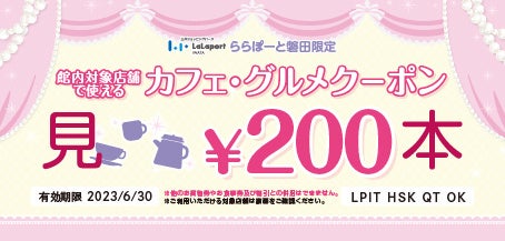 リカちゃん特別展示・サイコロゲーム・リカちゃんのなぞときパーティーの写真をご自身のSNSに「#ららぽーと磐田」をつけて投稿した画面の提示で、館内対象店舗で使用できる「カフェ・グルメクーポン200円分」を