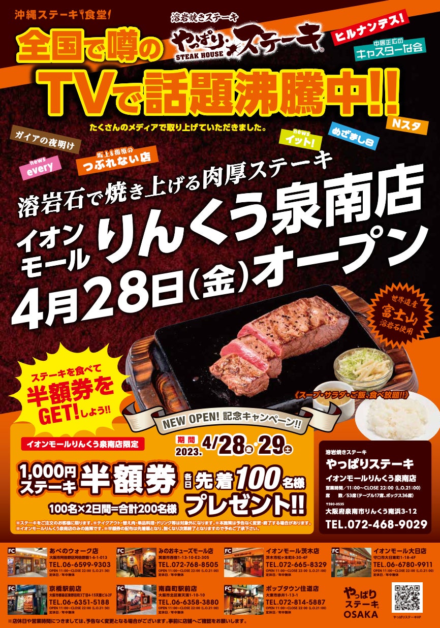 沖縄発のステーキ食堂やっぱりステーキの「やっぱりステーキイオンモールりんくう泉南店」が4月28日にOPEN