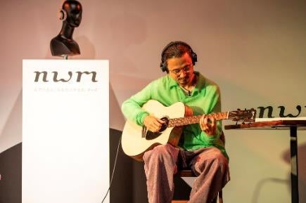 最後は長岡さん。音楽家ならではの表現をしていただくためにアコースティックギターを用意し即興で演奏してもらうことに。「nwm ONE」から焚火のような環境音に合わせ、ナチュラルで心地よいメロディーを奏でました。『弦って何も抑えていない時は開放弦というんですけど、あえて押さえていない音が混ざっている、開放感が入っているコードを使ってみました。』と機転を利かせた音作りを披露しました。