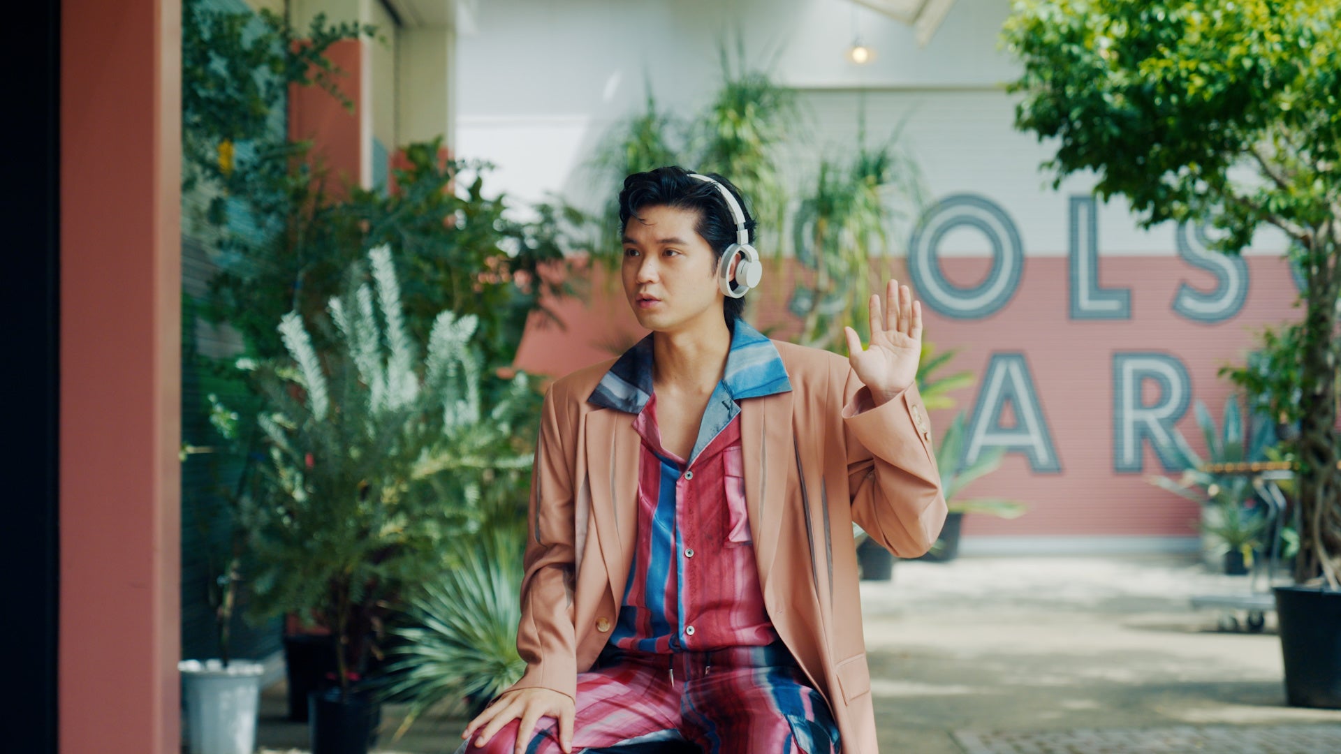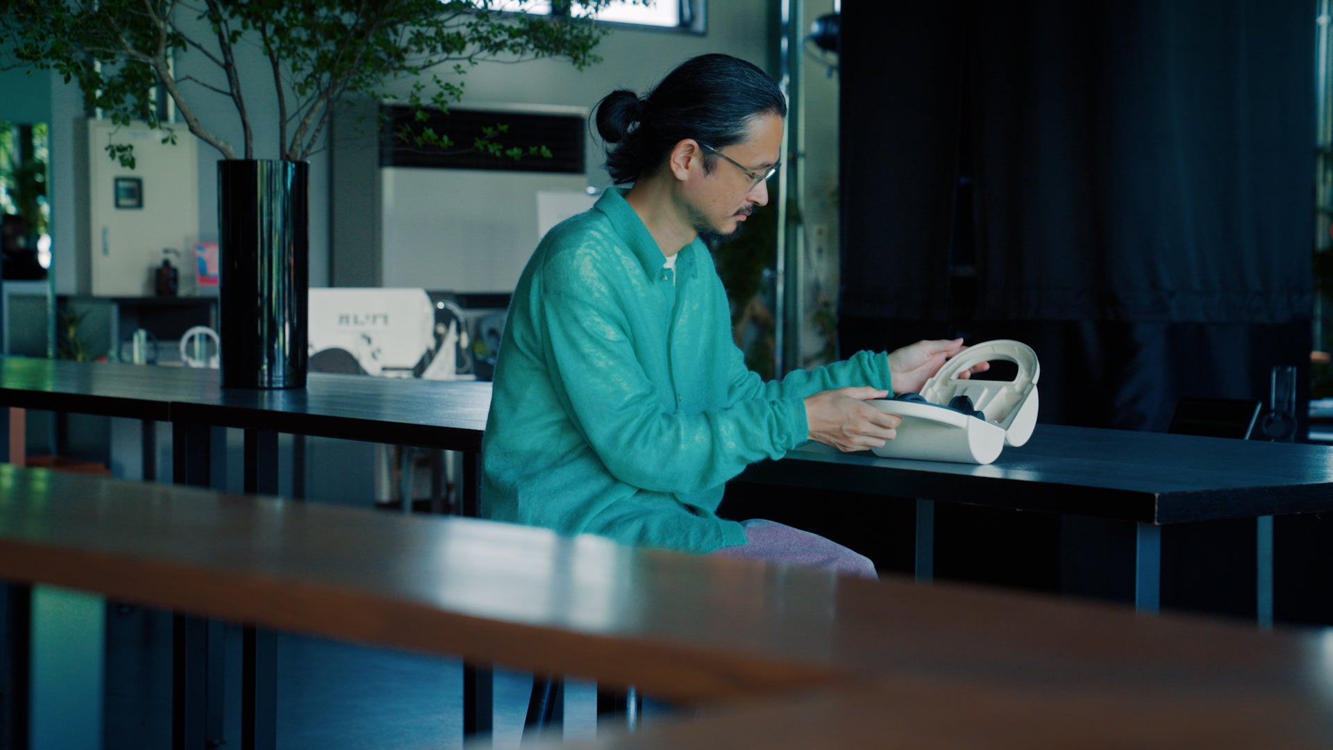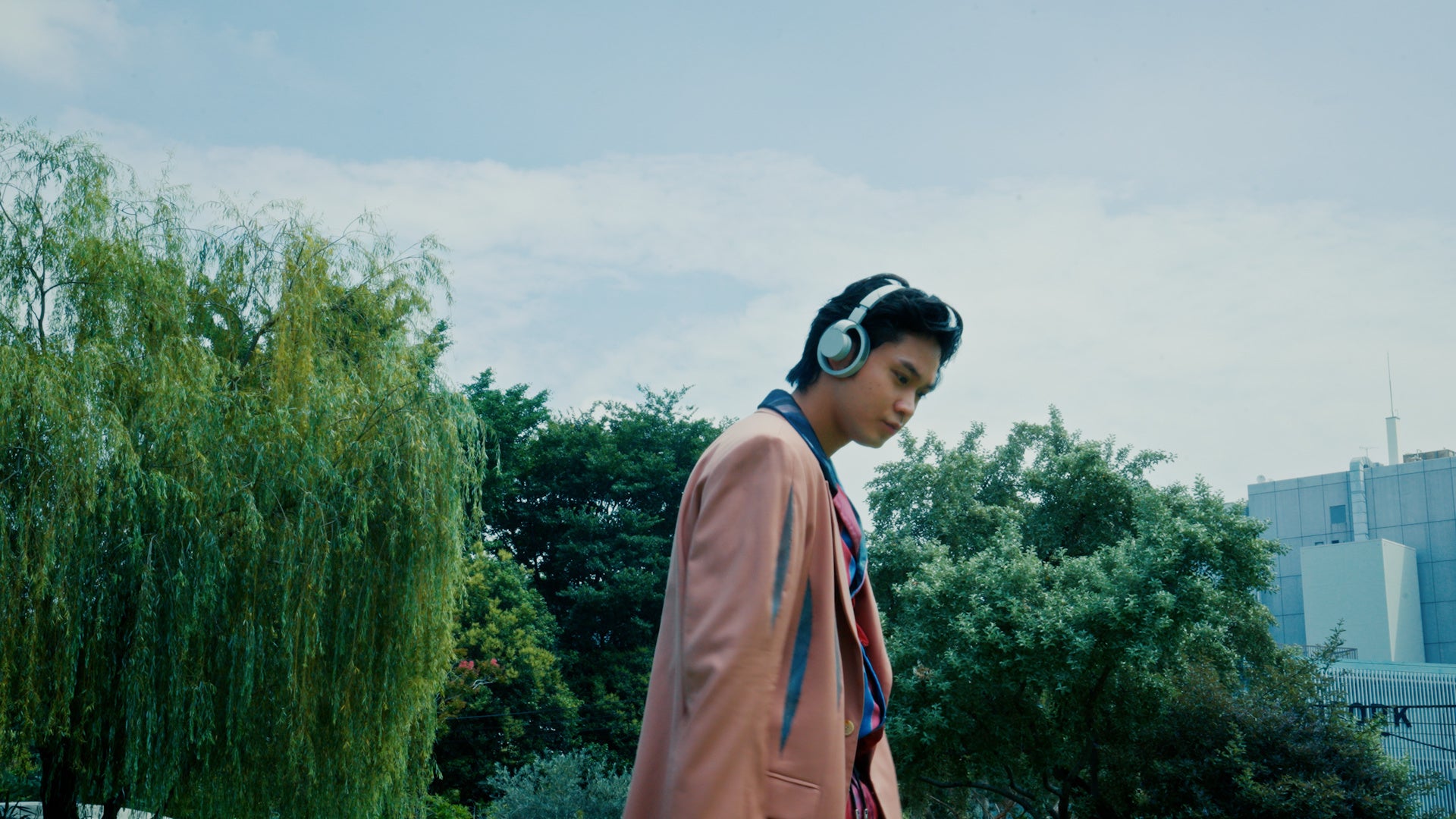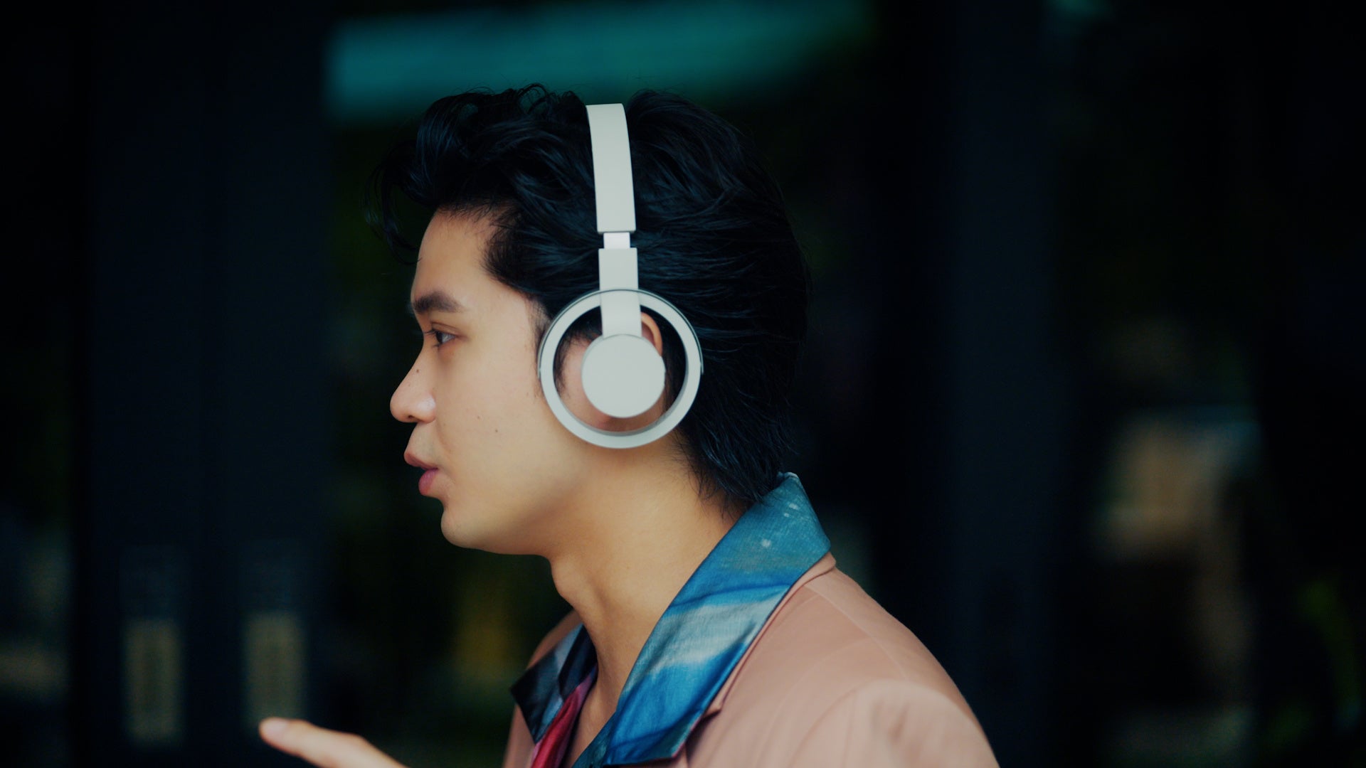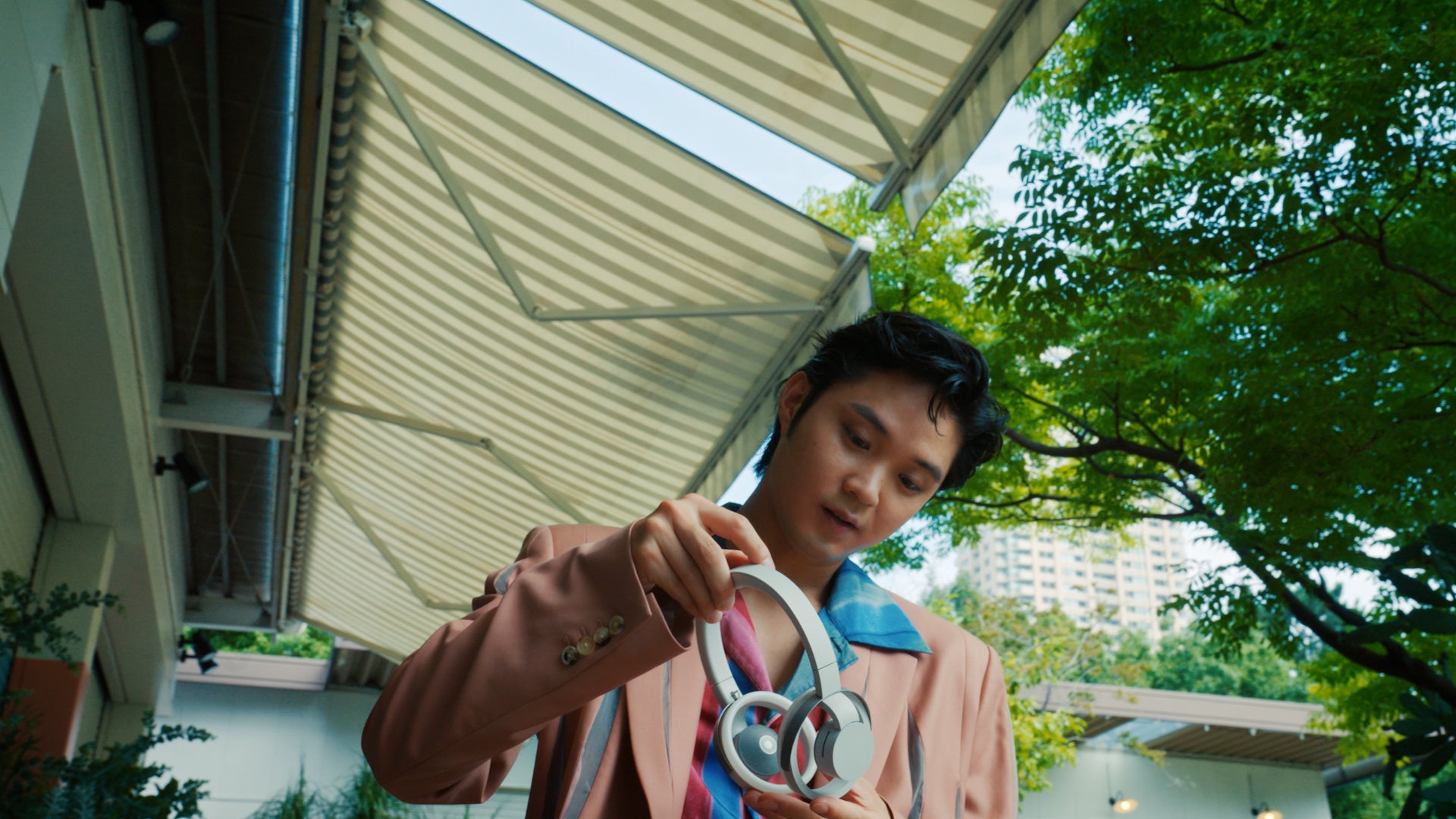 「nwm ONE」を初めて手に持った磯村さんはその軽さに驚いた様子。撮影当日は天候も良く、セミの鳴き声が響き渡っていたため、『外の環境音も聞こえるんですけど、それがノイズじゃない。聴いている音楽と外の音がmixされていくような、自分で作曲しているような感じ。この感覚は新しいですね。』とオープンイヤー型ならではの使用感についてコメント。『ゲームをしている際にインターホンの音にも気づける』と、自身の経験談を基にしたリアルな利用シーンも想像されていました。