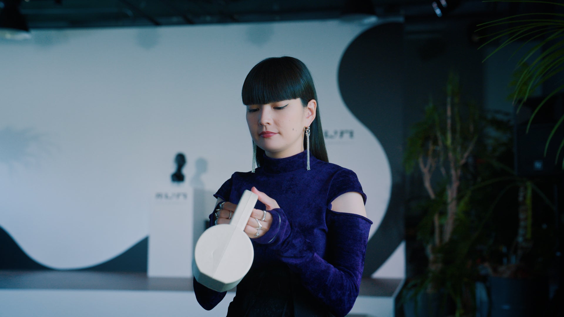 続いては『難しい~…何も考えられないです!』と迷いを見せていた秋元さん。「nwm ONE」から流れるビートが効いたBGMに乗せ、髪をなびかせながら振り返るポージングを披露。『会場に自然がたくさんあるので、大地で開放されている気持ちで風を感じたポーズにしました。』と説明。実は秋元さん、当日のファッションも「nwm ONE」に合わせたものにしており、『ジュエリーを着けていても圧迫されたことなく着けられることを伝えたかったのでピアスを大きめにしました。あとはライトグレイの「nwm ONE」にスペーシィなイメージがあったので、ベロアのトップスとサテンのスカートにして、光に合わせて表情が変わるものにしました。』