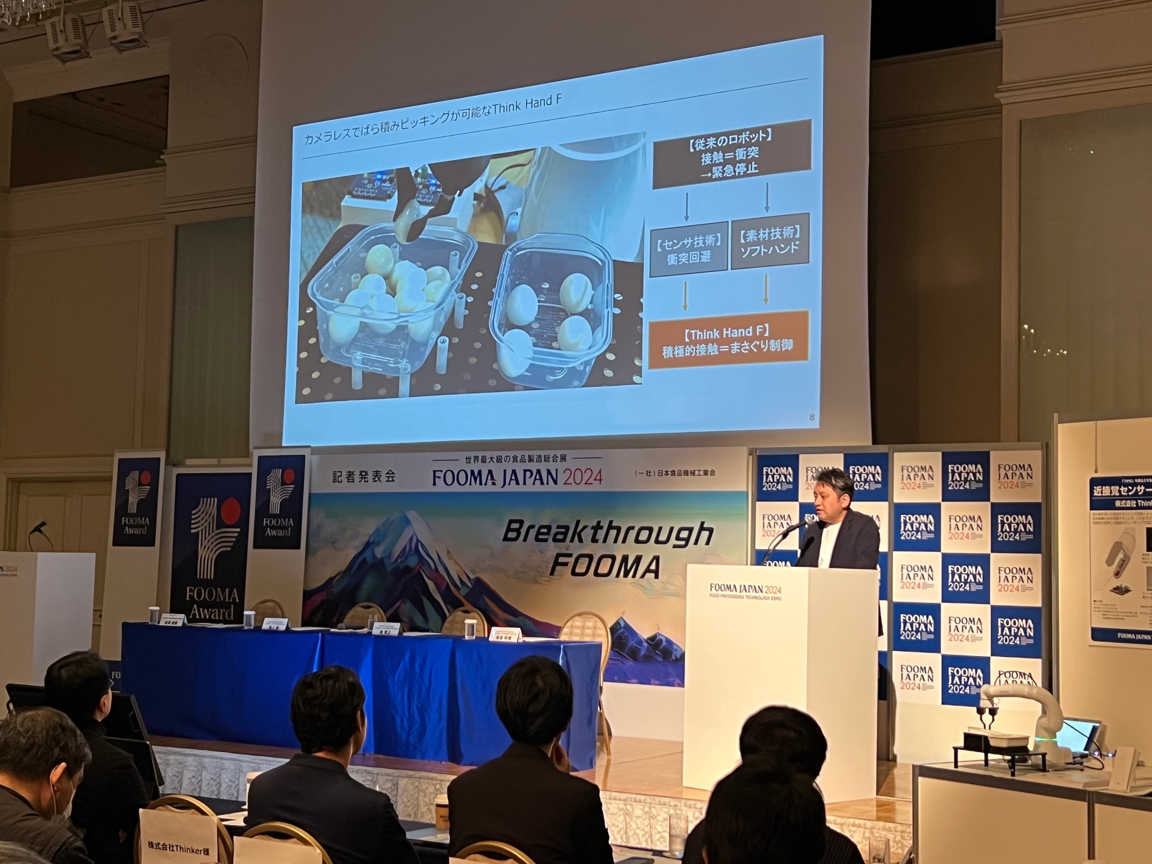 “指先で考えるロボットハンド”で協働ロボットの革新に取り組む株式会社Thinker(読み:シンカー、本社:大阪府大阪市、代表取締役兼CEO:藤本弘道、以下Thinker)は、2024年4月3日、一般社団法人日本食品機械工業会 展示会実行委員会が主催する「FOOMA JAPAN2024」の記者発表会にて、注目のスタートアップ企業としてピッチプレビューを実施。ロボットハンドの死角を克服する「近接覚センサー」について解説するとともに、カメラレスの次世代型ロボットハンド「Think Hand F」によるばら積みピッキングのデモンストレーションを披露いたしました。