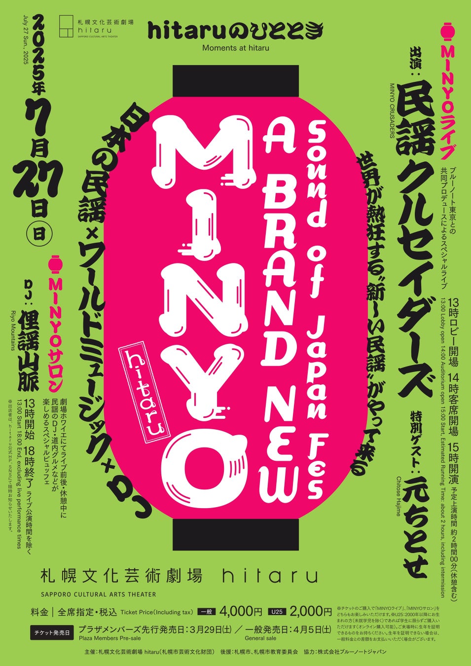 多くの人が耳にしたことがあり、口ずさめる“民謡”。いまや世界からも注目される日本の民謡の“新たな魅力”を存分に体感できる音楽フェス「Sound of Japan Fes」を開催!ブルーノート東京との共同プロデュースによるライブ公演「MINYOライブ」と、劇場ホワイエにてライブ公演の前後・休憩中に民謡のDJ・道内グルメなどが楽しめるスペシャルビュッフェ「MINYOサロン」の二本立てでお届けします。