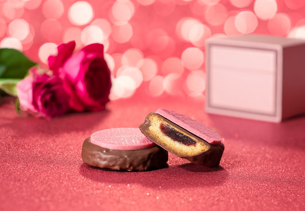 バターの香りと相性の良いクランベリー&ラズベリージャムをなかに閉じ込めて焼きあげたガレットに、ミルクチョコレートを纏わせてストロベリー&ラズベリーチョコレートプレートを合わせました。
