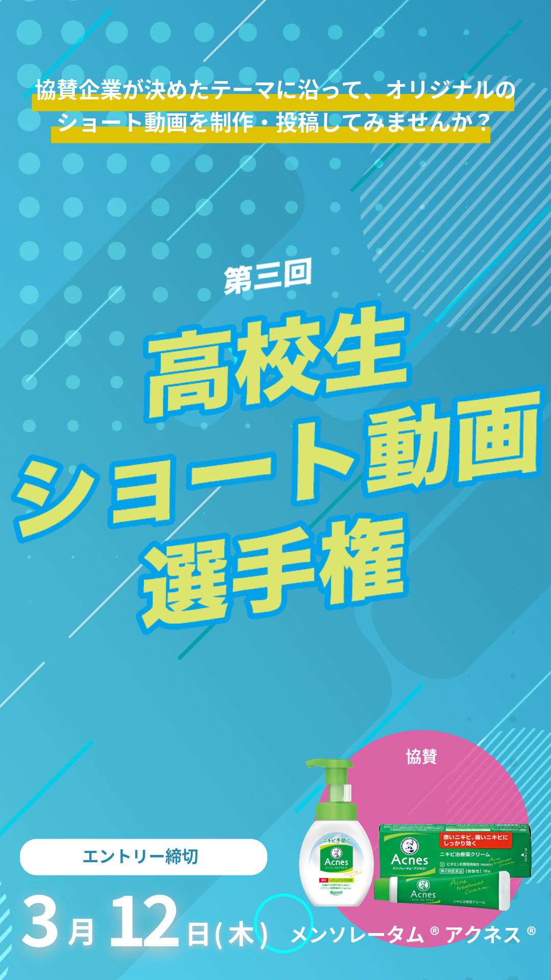第3回となる今回は、協賛企業であるロート製薬株式会社の【メンソレータムアクネス】をどう魅力的に表現・発信できるかを審査のポイントとして実施いたします。企業によるオリエンテーションなども予定しており、マーケティングや動画制作のノウハウを学びながら企画実行力や探究心、チームワークなどの能力を高める機会となることを目指しています。高校生が主体的に活動し、学びと思い出を得られるイベントとして開催を決定いたしました。