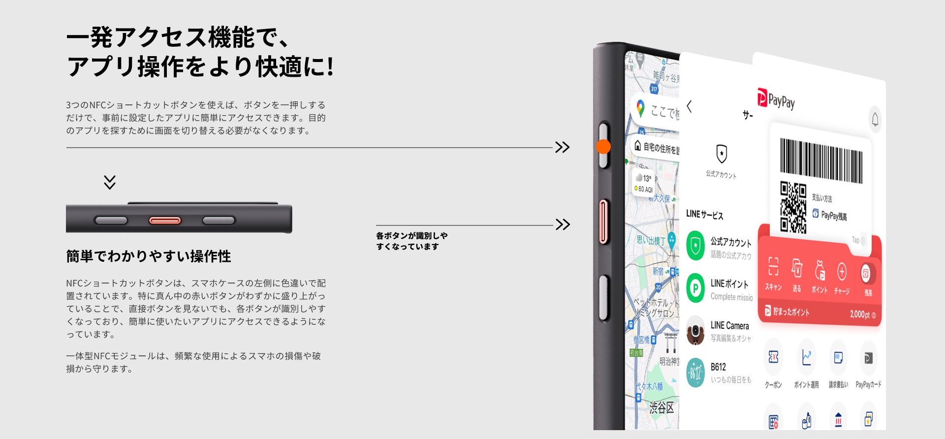 3つのNFCショートカットボタンを使えば、ボタンを一押しするだけで、事前に設定したアプリに簡単にアクセスできます。目的のアプリを探すために画面を切り替える必要がなくなります。