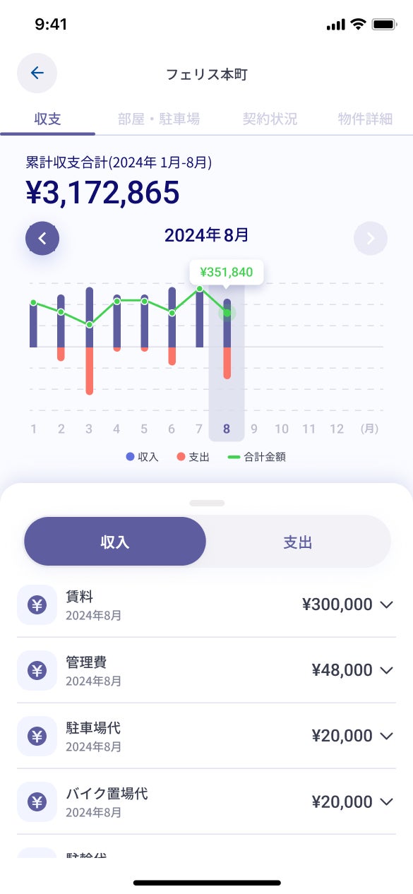 アプリ上で物件の収支状況や契約内容を確認でき、保有物件の情報をいつでもスピーディに把握できます。