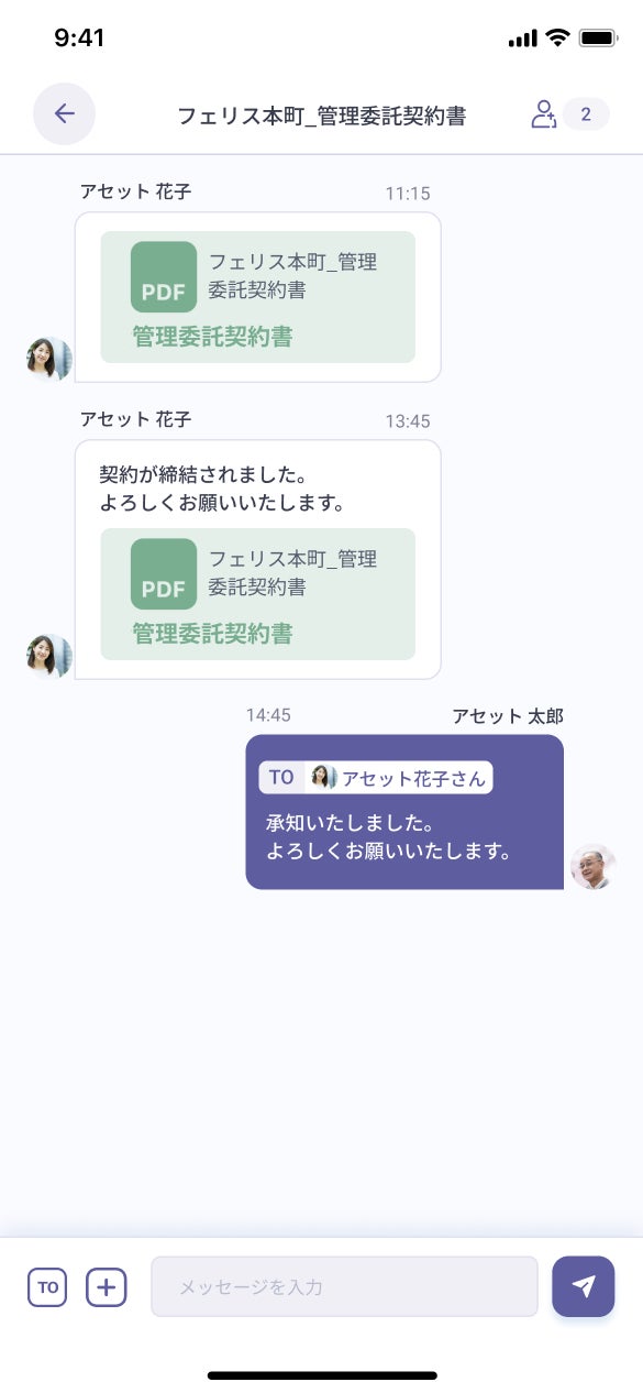 管理会社から届く「修繕見積書」「入居申込書」などの確認依頼をメッセージで受け取り、アプリ上で簡単に承認・否決の返答が可能になります。情報伝達が簡単になることで管理会社からの共有漏れを防ぎ、書類の確認や承認作業をどこにいてもあっという間に完了できます。