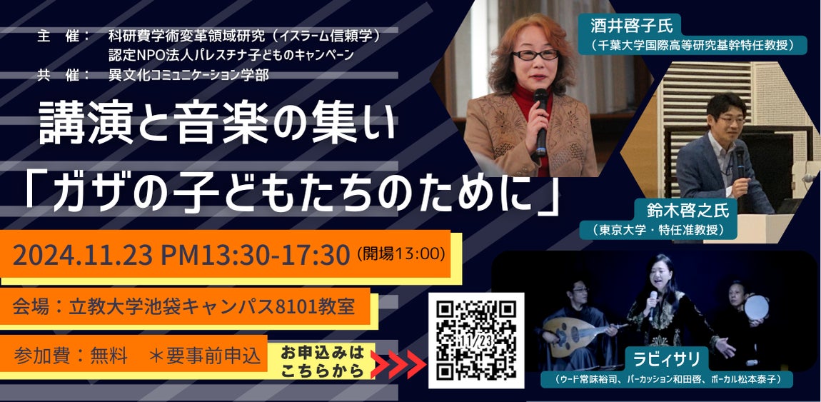 ◆主 催: 科研費学術変革領域研究(イスラーム信頼学)「紛争影響地域における信頼・平和構築」(研究代表者:石井正子(立教大学))、認定NPO法人パレスチナ子どものキャンペーン