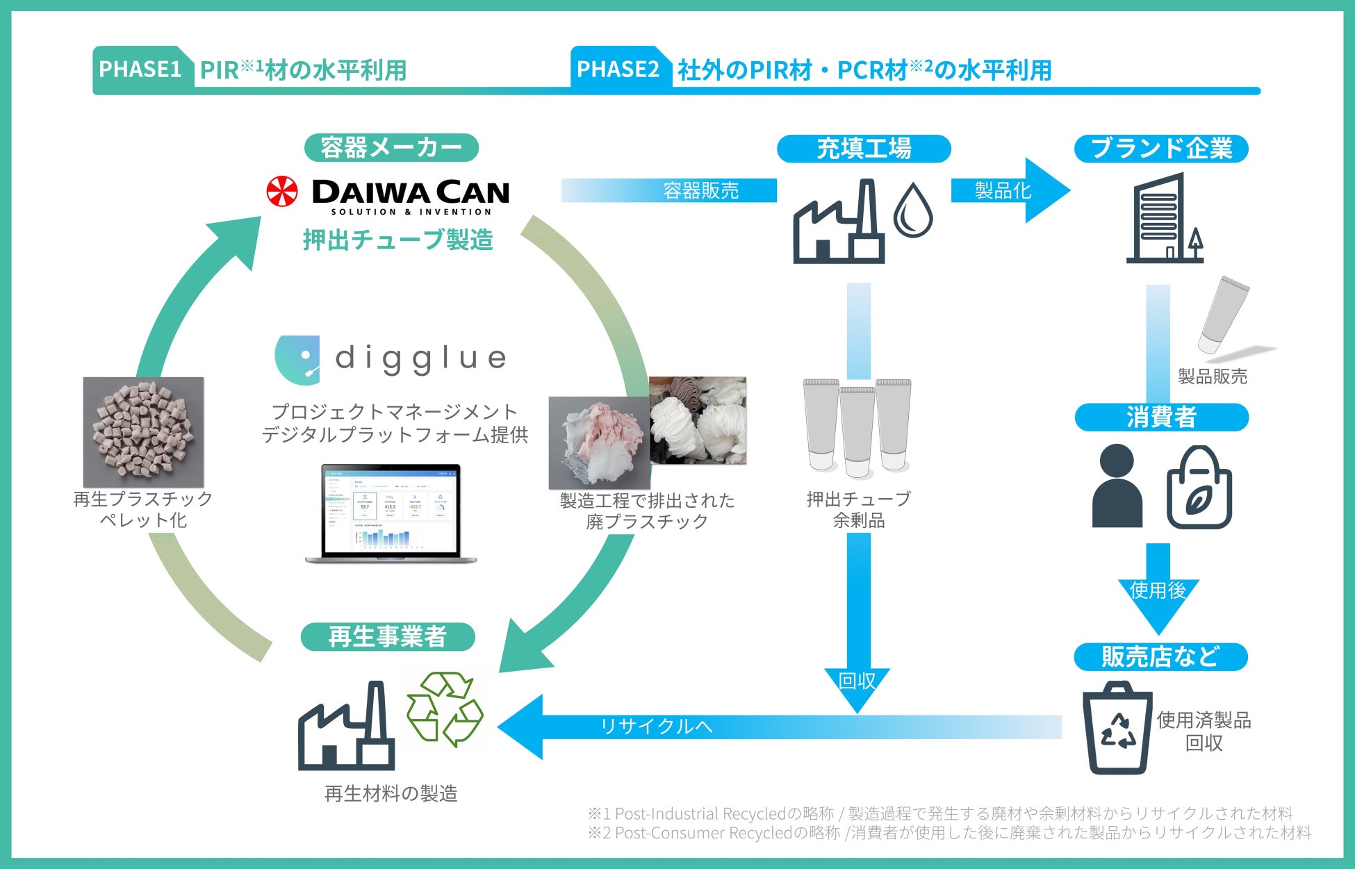 こうした課題に対し、大和製罐とdigglueではリサイクル事業を展開するヴェオリア・ジャパングループ協力のもと、押出チューブにおける製造工程で排出された廃プラスチックを粉砕・再生ペレット化し再生プラスチック材配合の押出チューブの試作~品質評価~効果試算までを実施しました(PHASE1)。