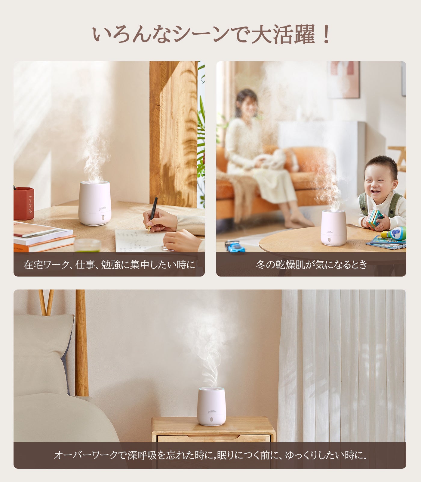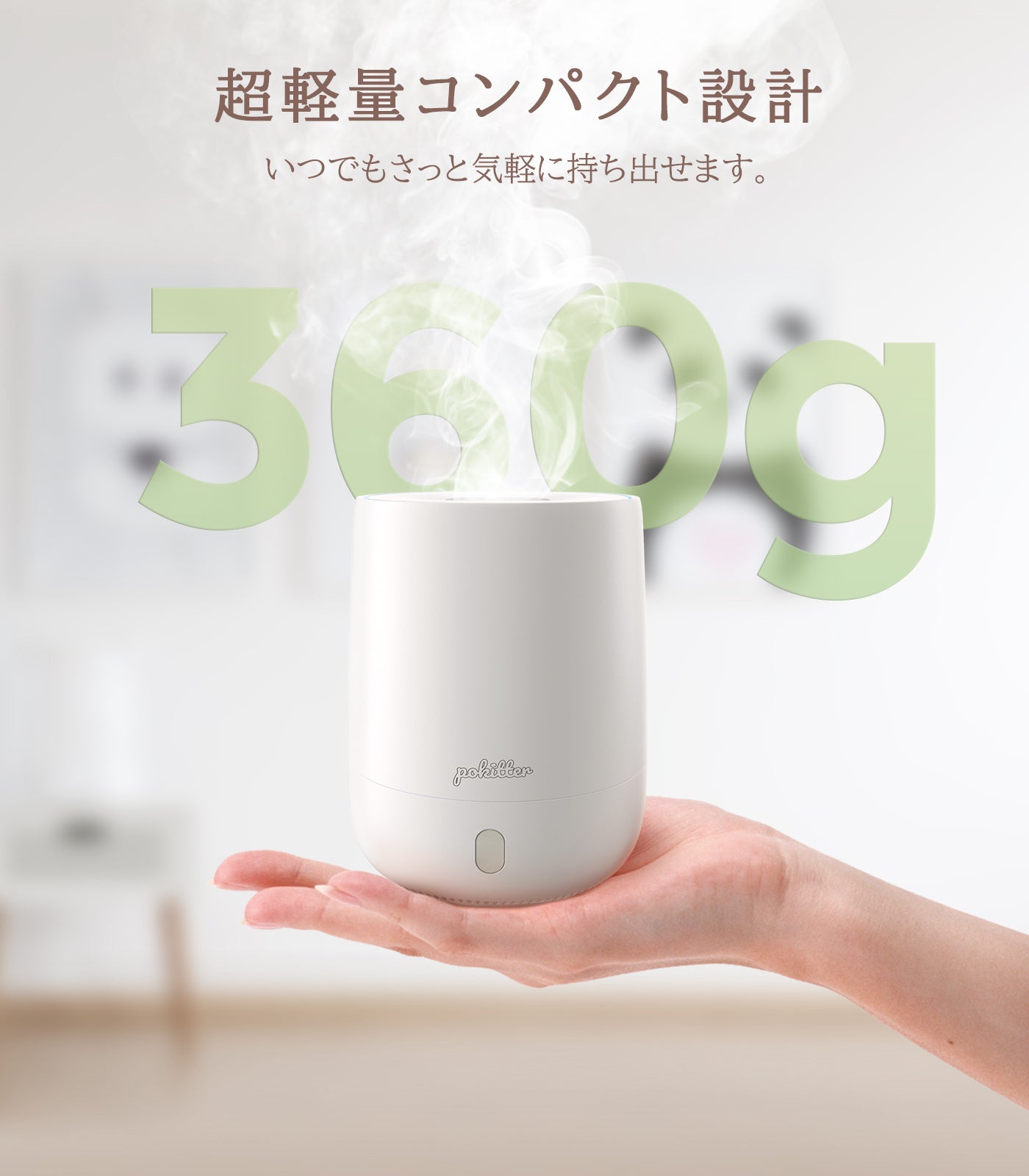また、超軽量設計でありながら、最大8時間の連続運転が可能です。わずか360gのポキッターのアロマディフューザーは、持ち運びも簡単で、どんな場所でも使用できます。さらに、水がなくなると自動的にシャットダウンされるため、安全面でも安心して使用できます。