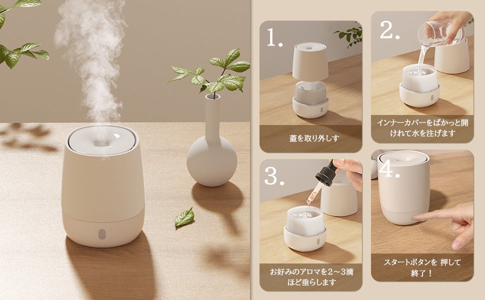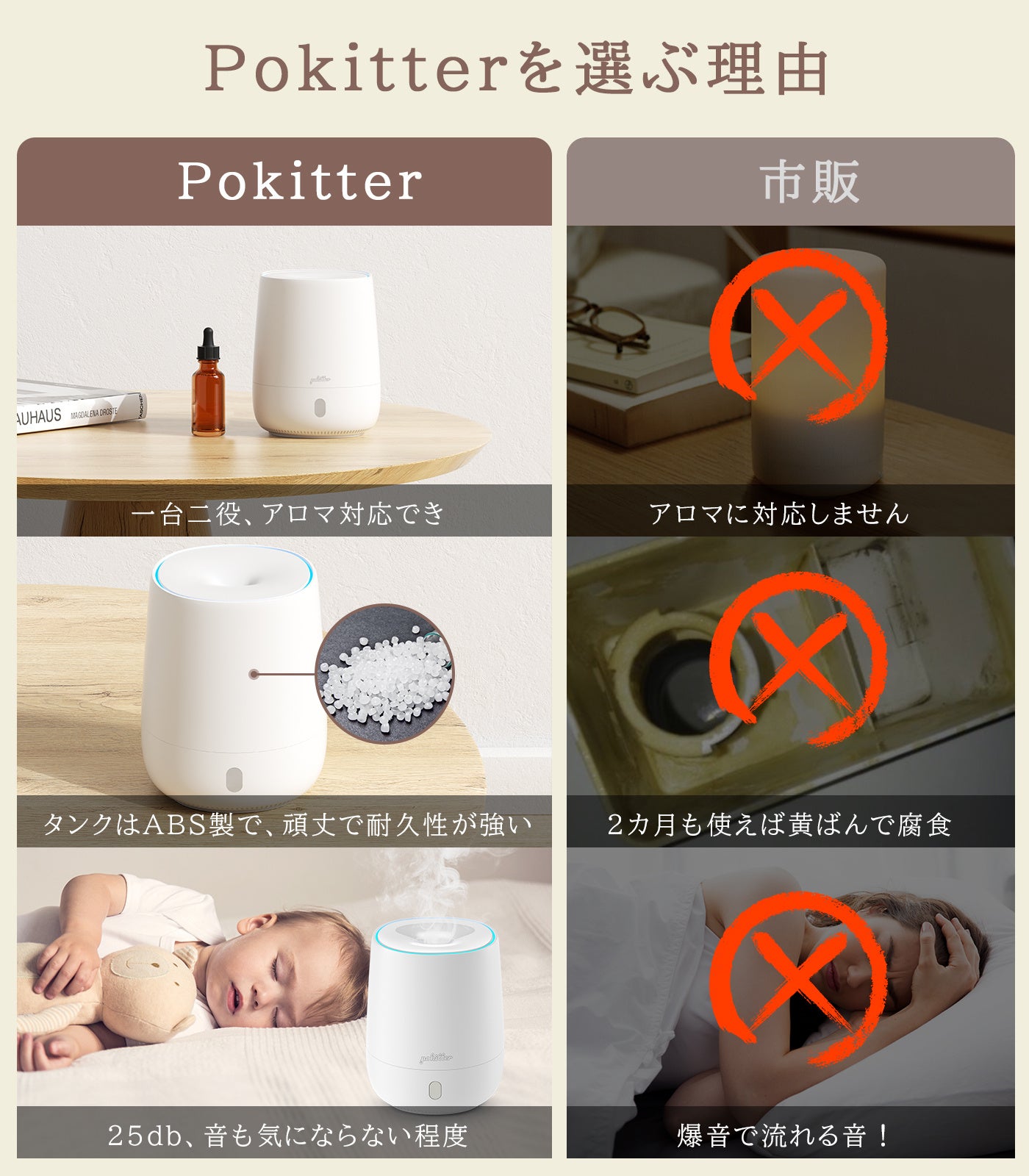 A.ポキッターのアロマディフューザーは、自然な香りと癒しを一緒に体験できる、軽量で簡単操作のアロマディフューザーです。