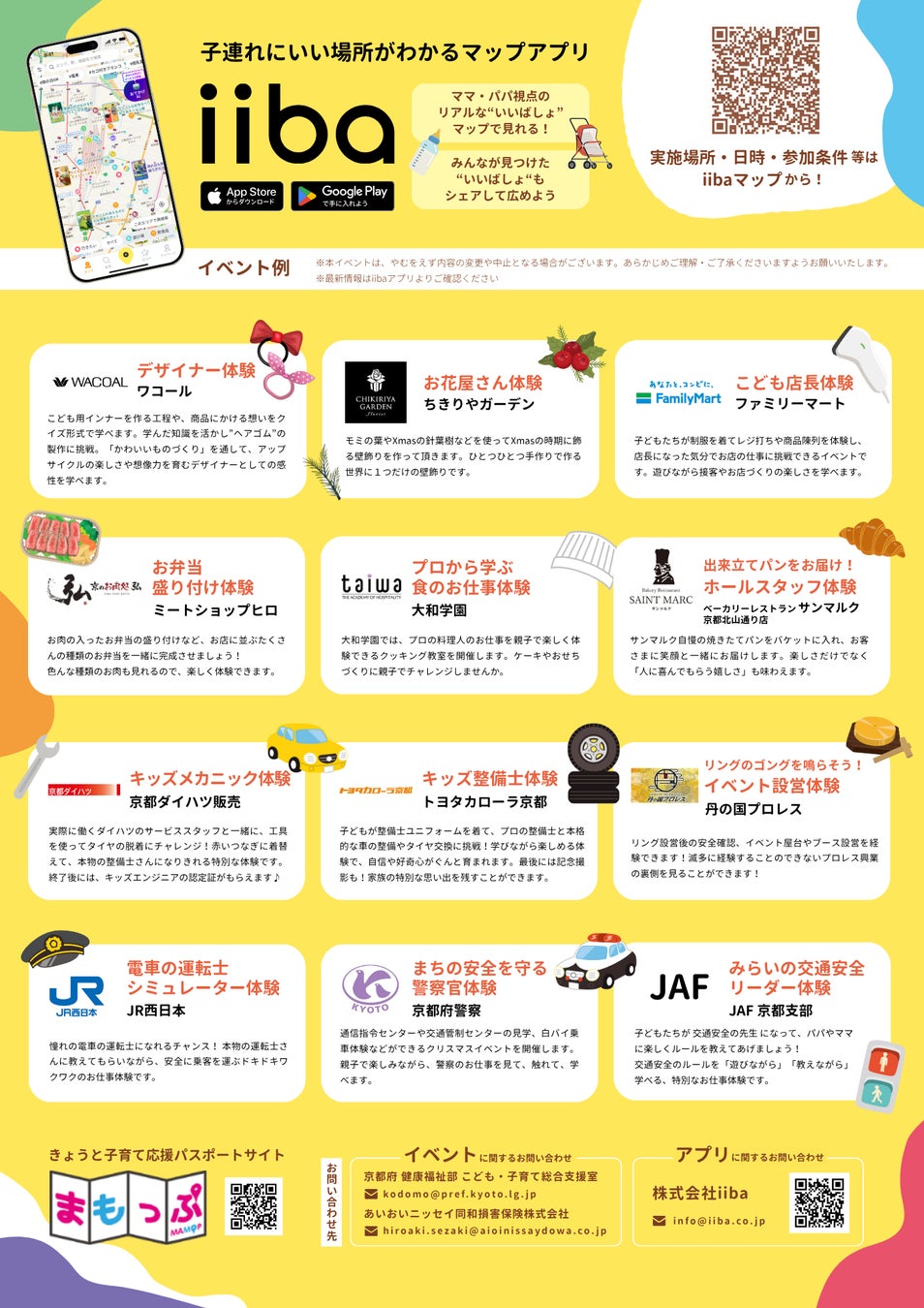 子育てマップアプリ『iiba』を運営する株式会社iiba (本社:東京都港区、代表取締役社長:逢澤奈菜、以下当社) は、京都府及びあいおいニッセイ同和損害保険株式会社と連携し、「キッズお仕事体験イベント」を2025年11月から12月まで京都府内で開催します。