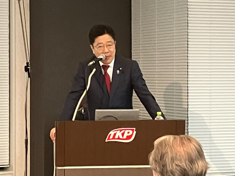 加藤勝信先生は「コロナ禍乗り越え、新たな時代に~「医療DX」の更なる推進に向けて~」と題し、我が国の少子化の進行と人口減少社会の到来を見据えて、2040年頃を展望した社会保障改革の新たな局面に対応した政策課題を示し、医療におけるDXの推進が急務であると述べられました。特にマイナーポータルは国民の医療プラットホームとして着実に推進していくべきとして、ただ急ぐだけでなく、国民への周知と理解を求めていくことが重要であり、行政としてはその努力を惜しまないと述べられました。質疑応答でも、フロアからの活発な意見や質疑がなされ、加藤先生には率直かつ明解なご意見を賜り、濃密な1時間となりました。また懇親会にもご参加いただき、参加者との貴重な対話の機会を頂戴することができました。