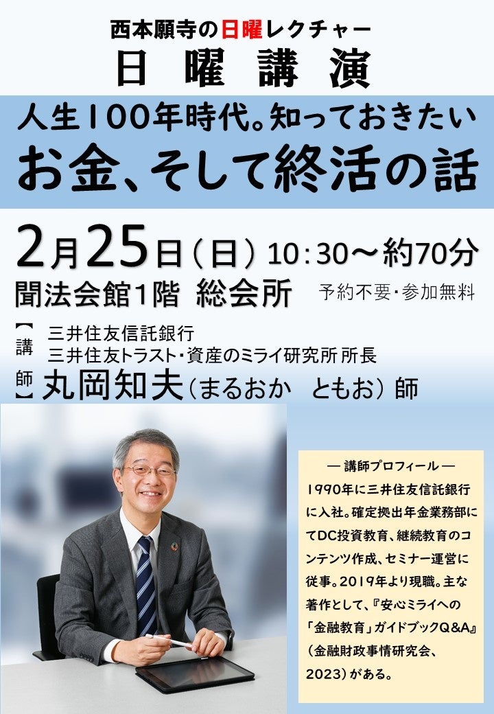 西本願寺 日曜講演 2月開催のお知らせ【人生100年時代。知っておきたいお金、そして終活の話】