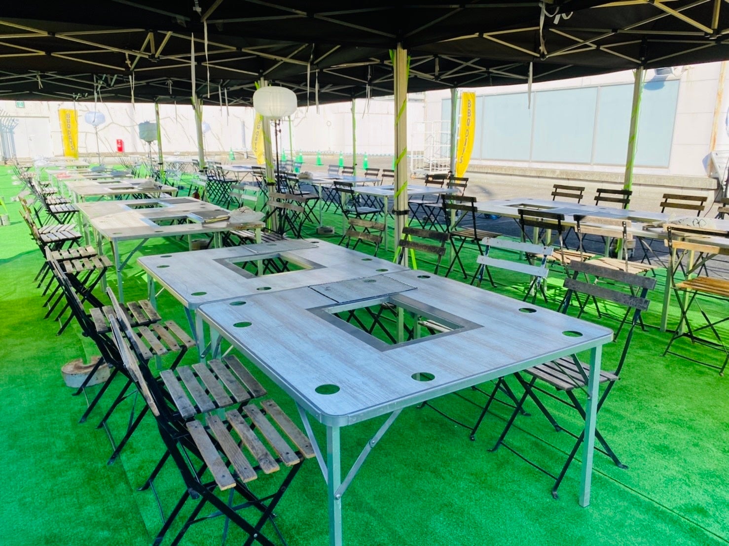 屋上に設けられた会場内(屋外 テント屋根付)に、テーブル30卓、席120席を用意。テーブルの中央には炭火のコンロを設置している。