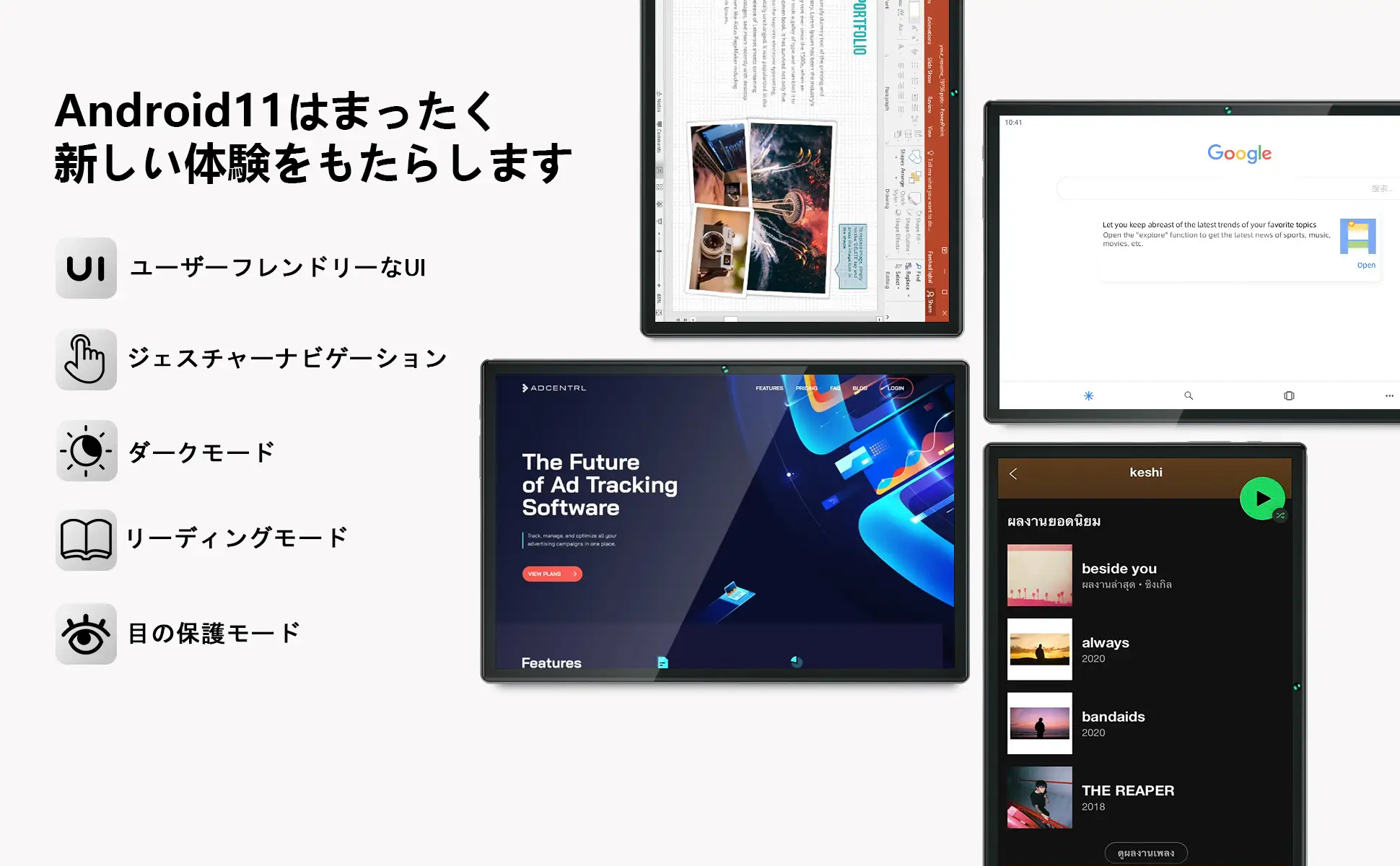 I10PROタブレットには Android 11 システムが搭載されており、ダークテーマ、ジェスチャー ナビゲーション、カスタムアイコンシェイプなどの機能が追加されましたs。シンプルかつ安全なUIでスムーズなタップ、スワイプ、スクロールの操作が出来ます。 システムの安全性も向上させており、ユーザーのデータセキュリティとプライバシーをより効果的に保護できます。GMS認証済みより、Google Play ストアから様々なゲーム、音楽、映画、テレビ、本、雑誌などにアクセスし、お気に入りのアプリ、Facebook、Netflix、TikTok、YouTube、LINEやTwitterをインストールできます。
