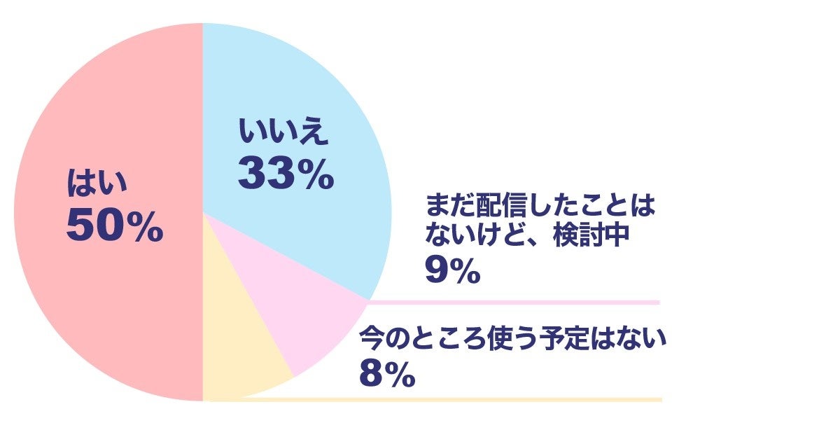 「はい」が50%で一番多く、「まだ、配信したことはないけど。検討中」が9%という回答がありました。半分以上はライブ配信の経験があると伺えます。
