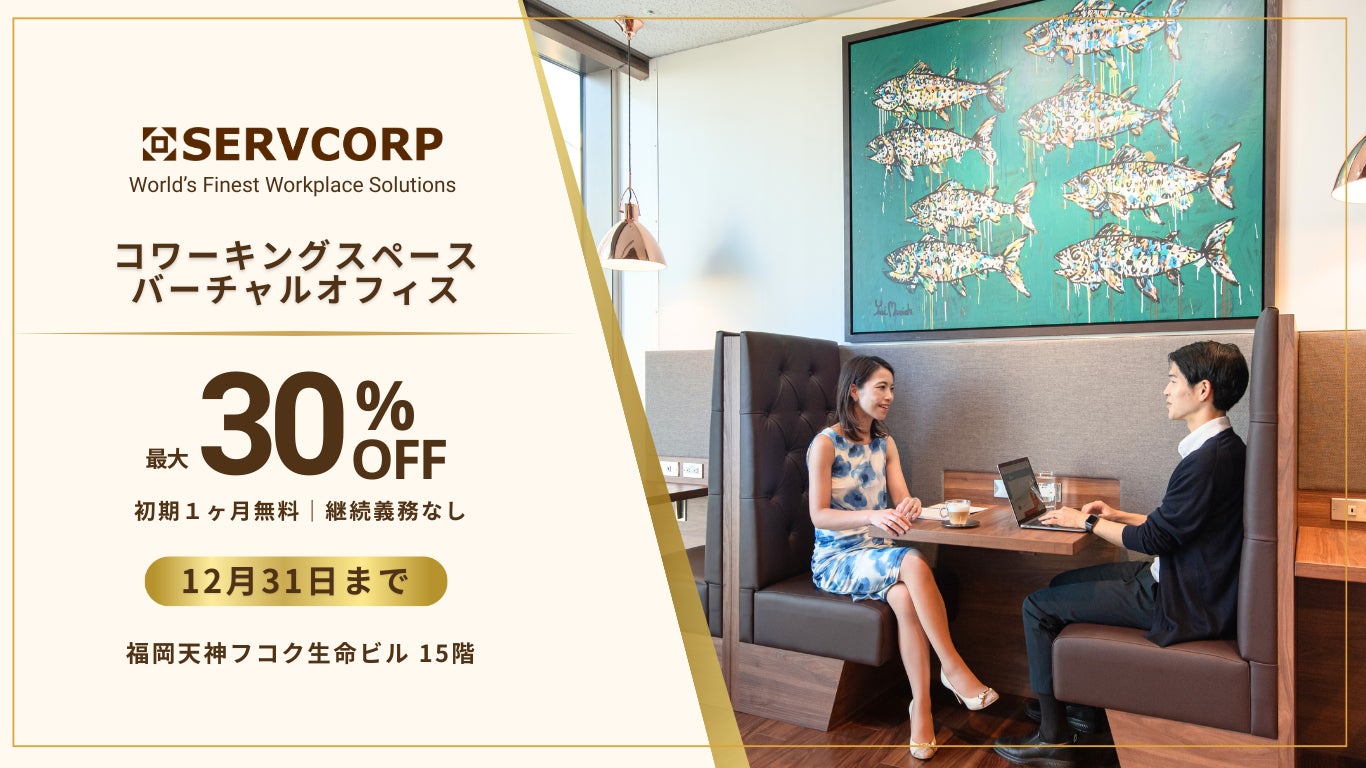 今月で天神拠点の開設16周年を記念し、2025年12月1日から12月31日まで、サーブコープ 福岡天神フコク生命ビルのコワーキングスペースとバーチャルオフィスが最大30%OFFになるスペシャルオファーをご提供いたします。また、初期1ヶ月無料・継続義務なし・保証金不要の特典も併せてご利用いただけます。ぜひこの機会にご検討いただけますと幸いです。
