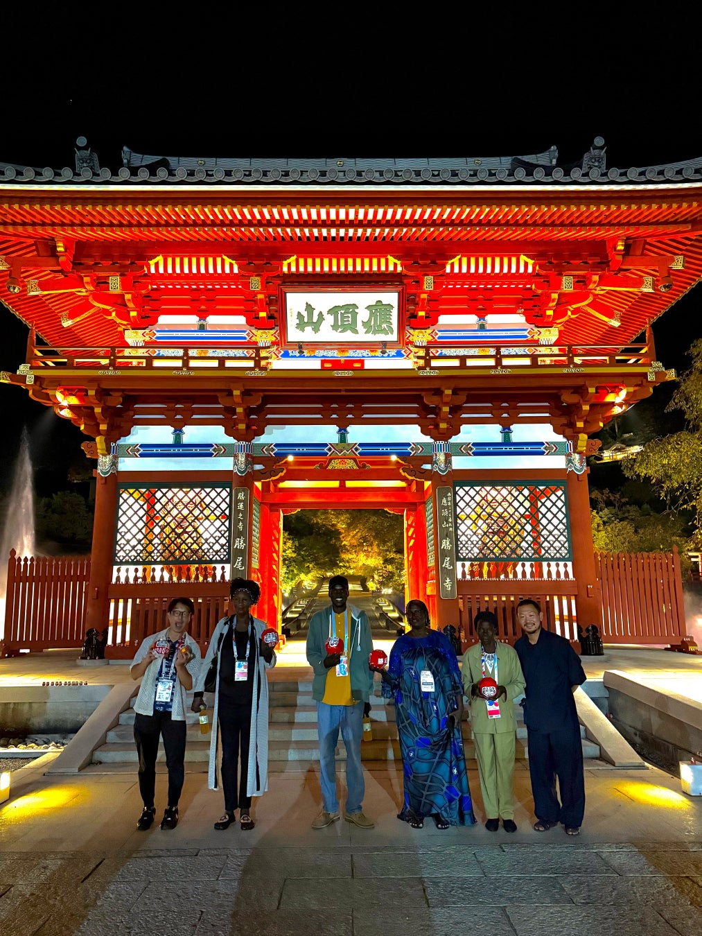 南スーダンの方々に、いかにお越しいただくかを考えていたところ、多大なるご協力をいただいのが、“世界200ヶ国以上の国歌が歌える”アーティストであるKENT(本間健太郎 Kentarrow Homma)氏です。KENT氏は勝尾寺がチャレンジしている『#WDC』の理念に共感し、南スーダンの方にお声がけいただきました。皆さんは10月12日に長時間にわたる会議があったものの、KENT氏による『#WDC』の説明に賛同いただき、万博閉場後に勝尾寺に来訪くださいました。夜中であったため『#WDC』の舞台で国旗を持っての撮影は叶いませんでしたが、勝尾寺のダルマを持ってライトアップされた山門の前にてご参加いただきました。